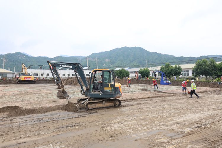 8月4日上午,密云区冯家峪镇西庄子村,大型机械清理广场淤泥。