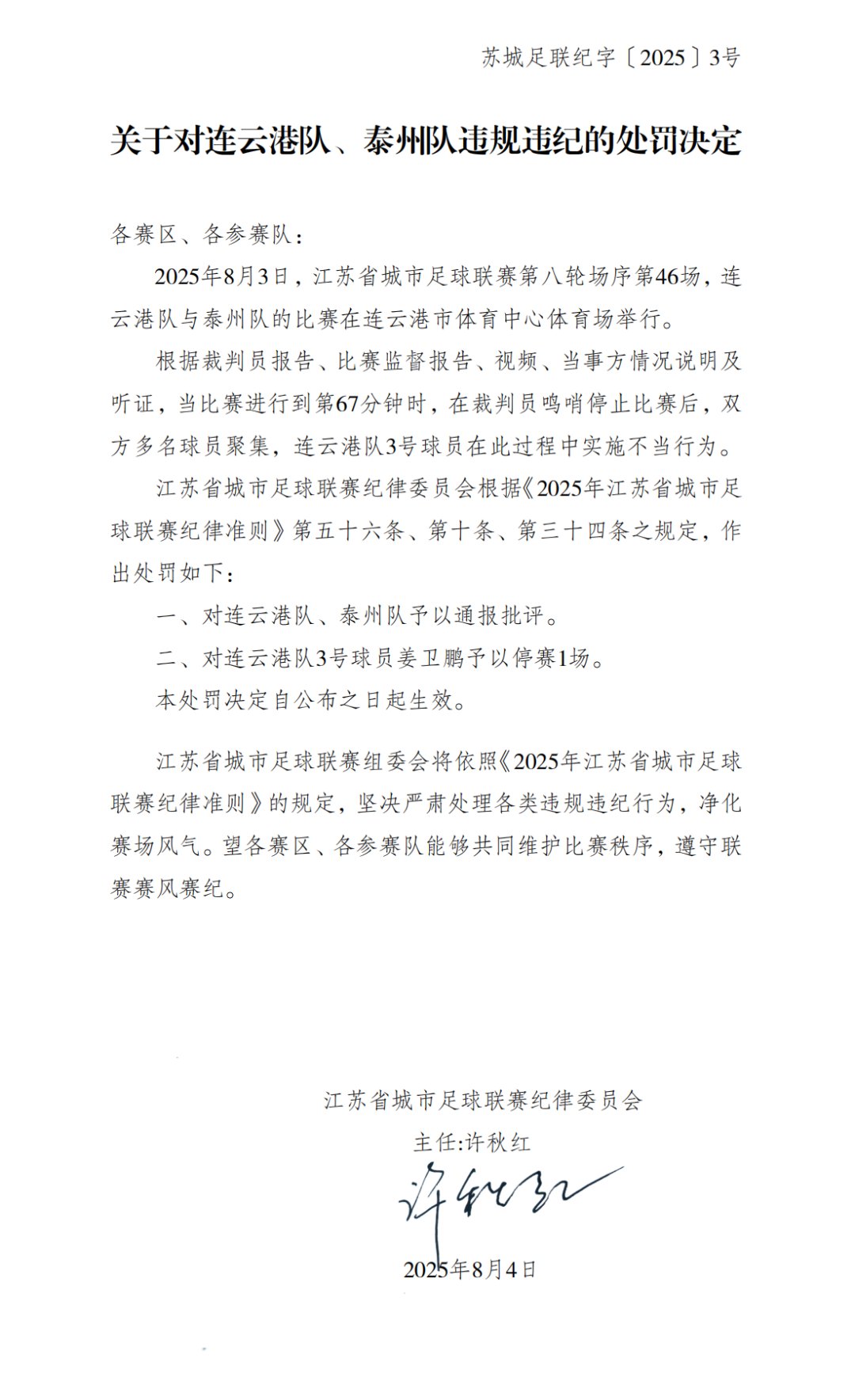 新京报讯 8月4日,江苏省城市足球联赛在其官微发布关于对连云港队、泰州队违规违纪的处罚决定。