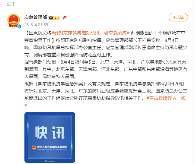 据气象部门预报,8月4日夜间至5日,北京、天津、河北、广东等地部分地区有大到暴雨,其中,北京东部、天津南部、河北东部、广东中部和东南部沿海等地区有大暴雨,局地有特大暴雨。 根据《国家防汛抗旱应急预案》及有关规定,国家防汛抗旱总指挥部8月4日20时将针对北京、天津、河北、广东的防汛四级应急响应提升至三级。国家防总办公室前期派出的工作组继续分别在京冀粤协助指导防汛相关工作。