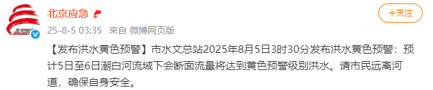 新京报讯 据北京应急官博消息,市水文总站2025年8月5日3时30分发布洪水黄色预警:预计5日至6日潮白河流域下会断面流量将达到黄色预警级别洪水。请市民远离河道,确保自身安全。