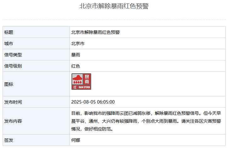 新京报讯 据北京市气象局消息,北京市解除暴雨红色预警。