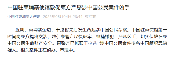 新京报讯 据中国驻柬埔寨大使馆微信公众号消息,近期,柬埔寨金边、干拉省先后发生两起涉中国公民命案。中国驻柬使馆第一时间向柬方提出交涉,敦促柬警方尽快破案、抓捕嫌犯、严惩凶手,切实保护在柬中国公民生命财产安全。柬警方已抓获干拉省涉中国公民案件多名中国籍犯罪嫌疑人。相关案件正在侦办、审理中。