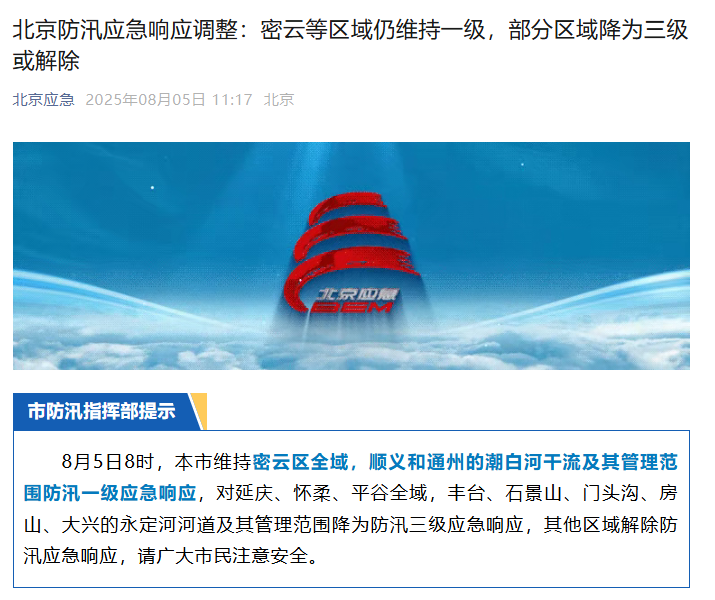 北京防汛应急响应调整:密云等区域仍维持一级,部分区域降为三级或解除
