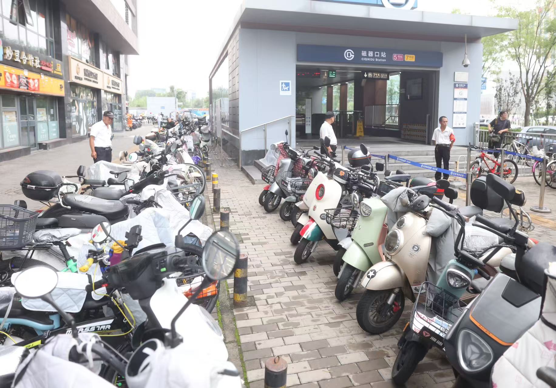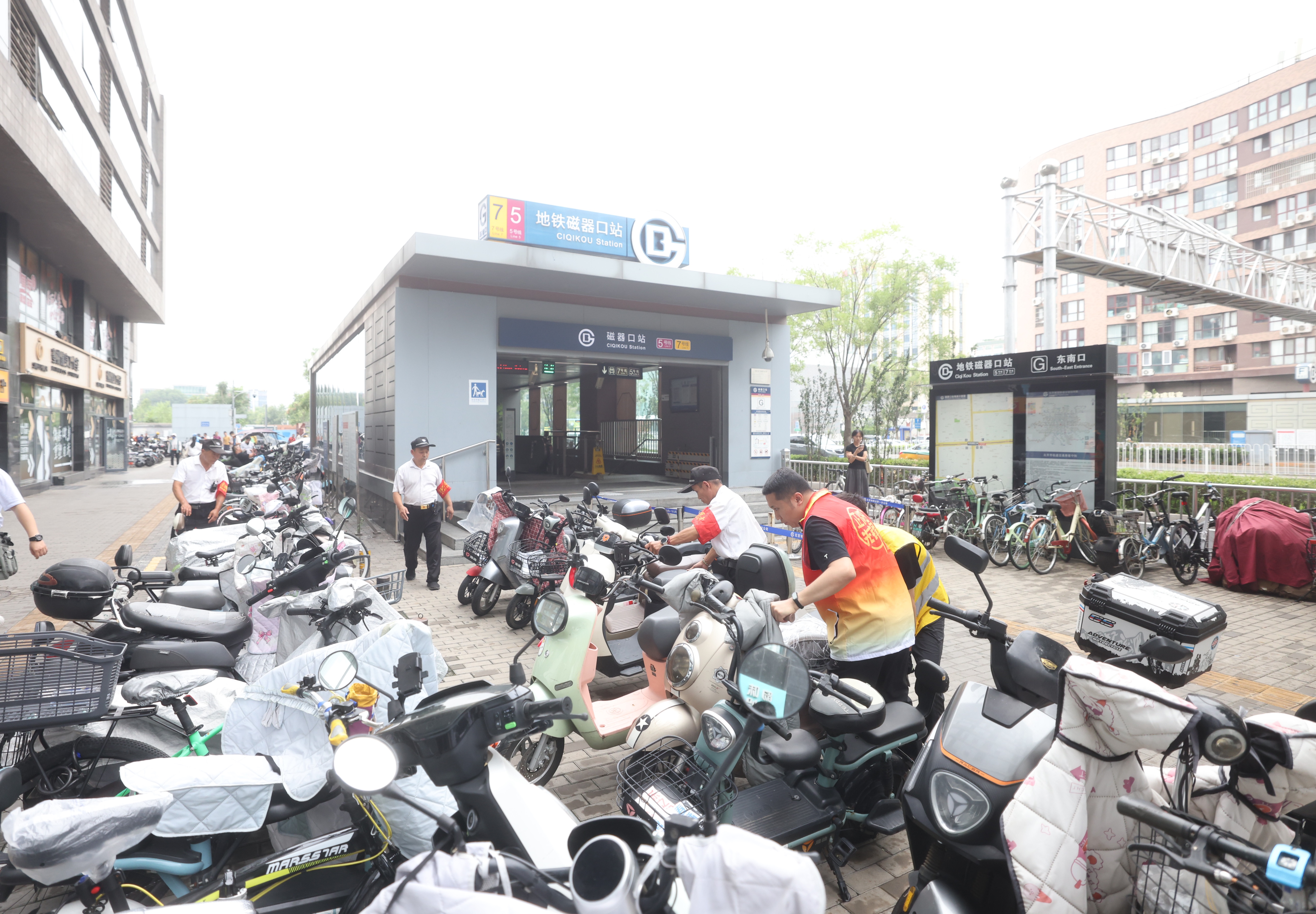 同时,因地制宜、分区管理:在部分站口周边,近端用于电动车停放,远端用于共享单车停放,有效缓解混停堆积、存取不便和成片倒伏等问题。另外,统筹动员社工、环卫、保安、志愿者等群体,共同参与停放秩序巡查和车辆清淤、码放。尤其是在北京全市率先引入文明引导员支援重点站口,早晚高峰在地铁站口引导电动车有序停放。