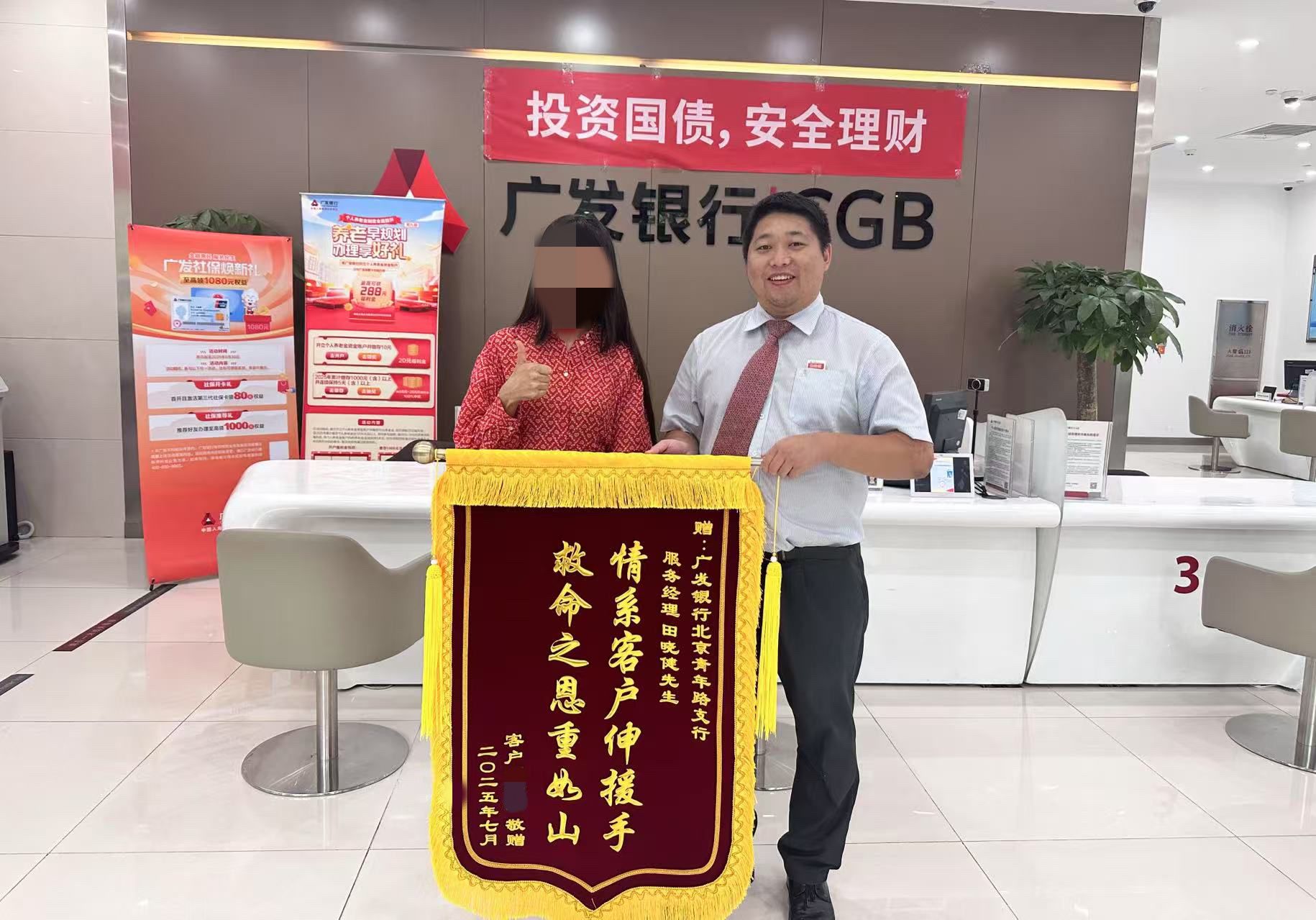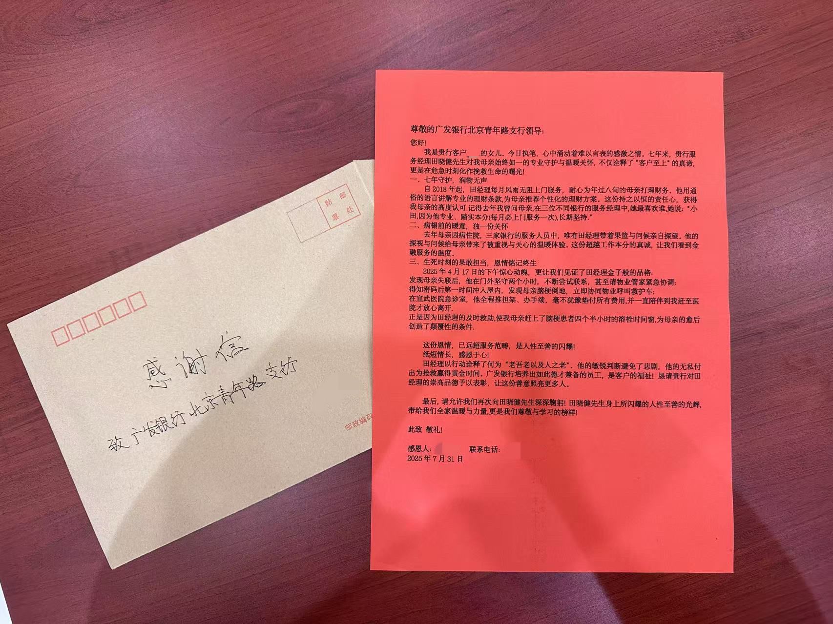 2025年7月31日,病人家属将一面锦旗和一封感谢信送到了广发银行北京青年路支行,信中写道: