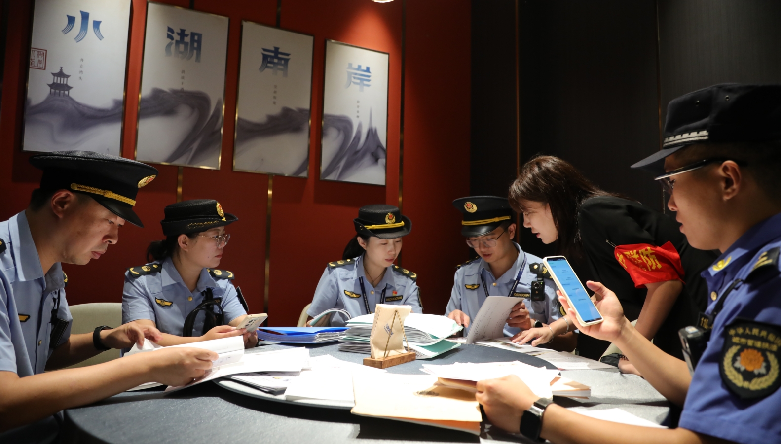 8月6日,在海淀区华熙商圈等场所,北京多个执法部门联合开展“综合查一次”检查。海淀区市场监管局供图