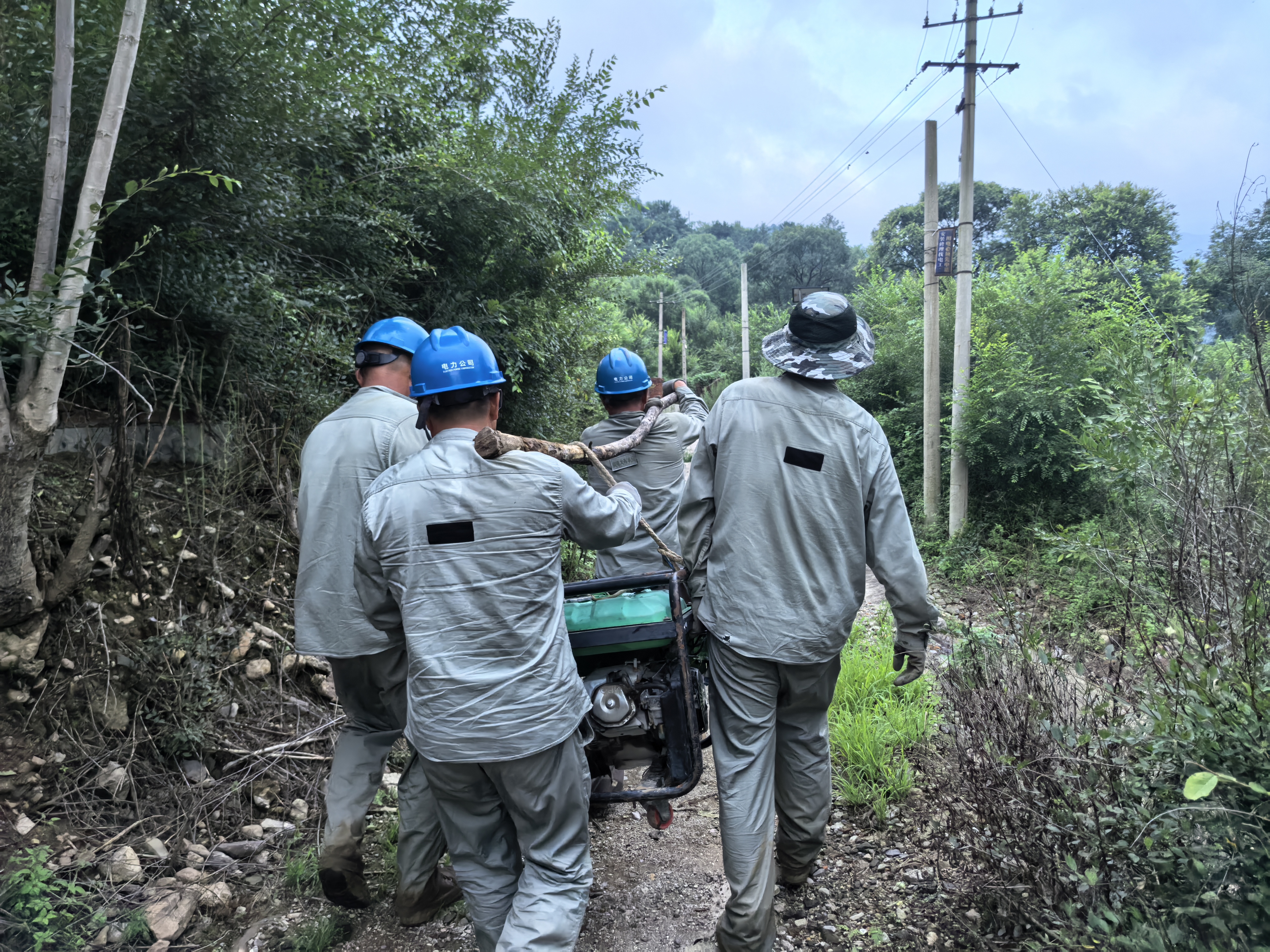7月28日,国网北京延庆供电公司抢修人员肩扛手拉发电机为百姓提供应急供电。史海垚 摄