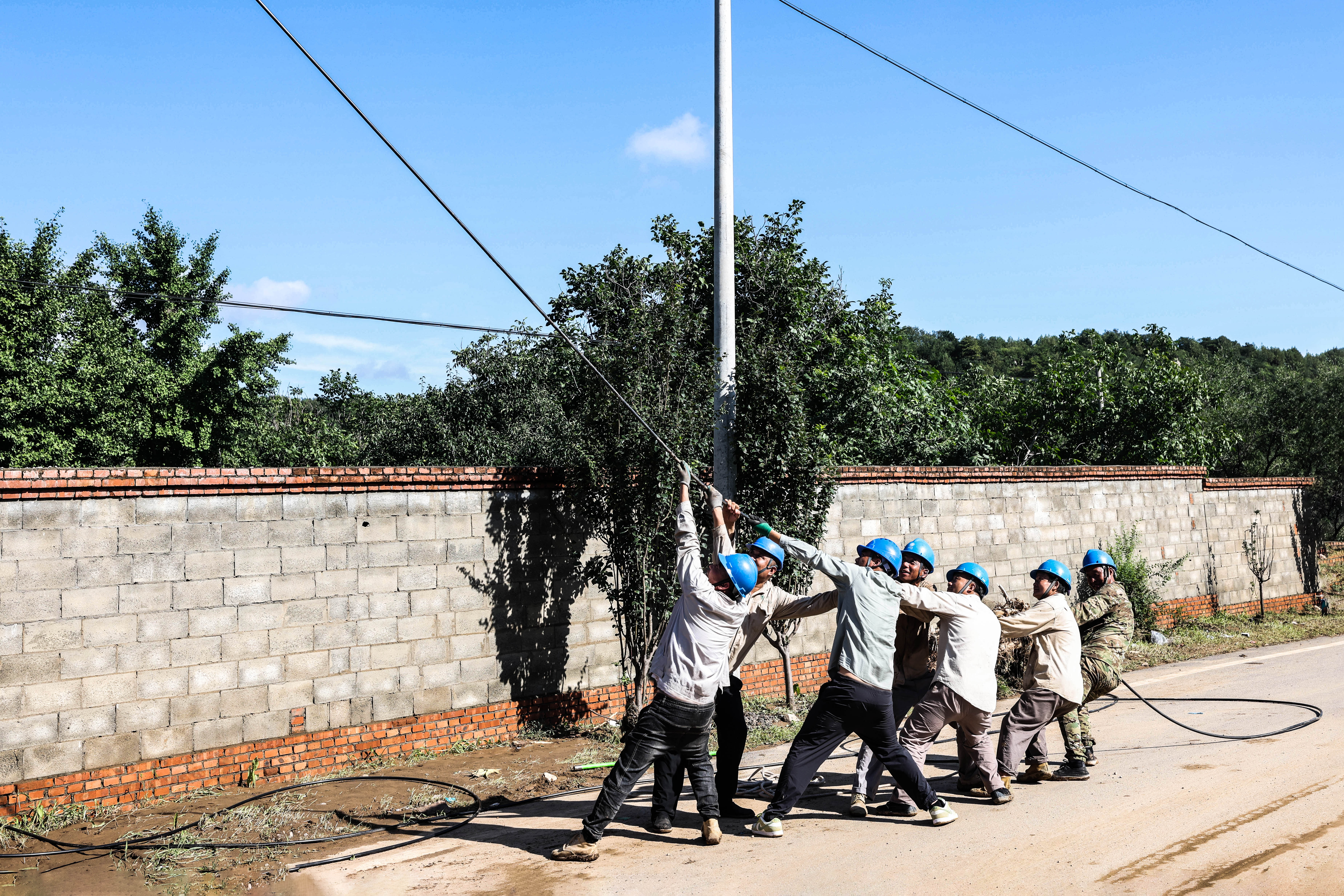 7月29日,国网北京平谷供电公司工作人员在金海湖镇将军关路抢修受损的电力设施。刘小军 摄