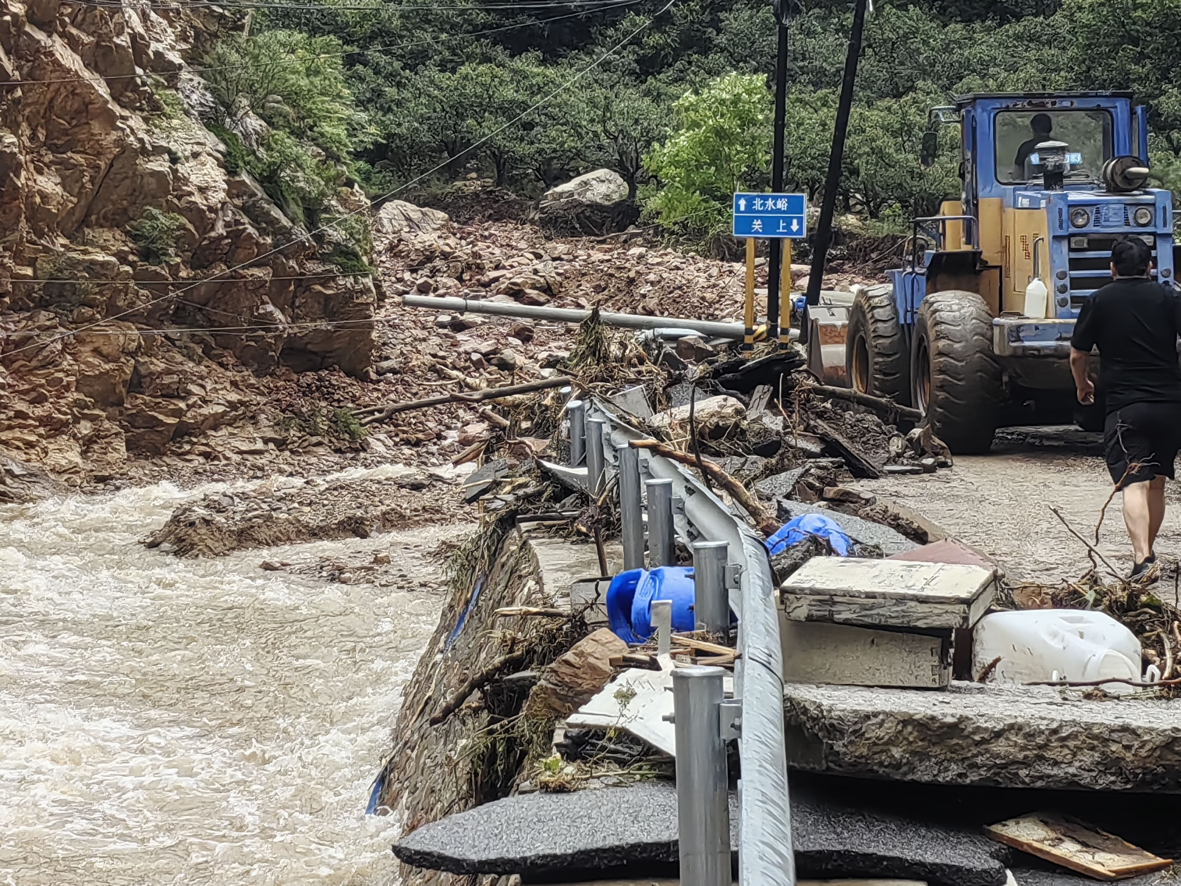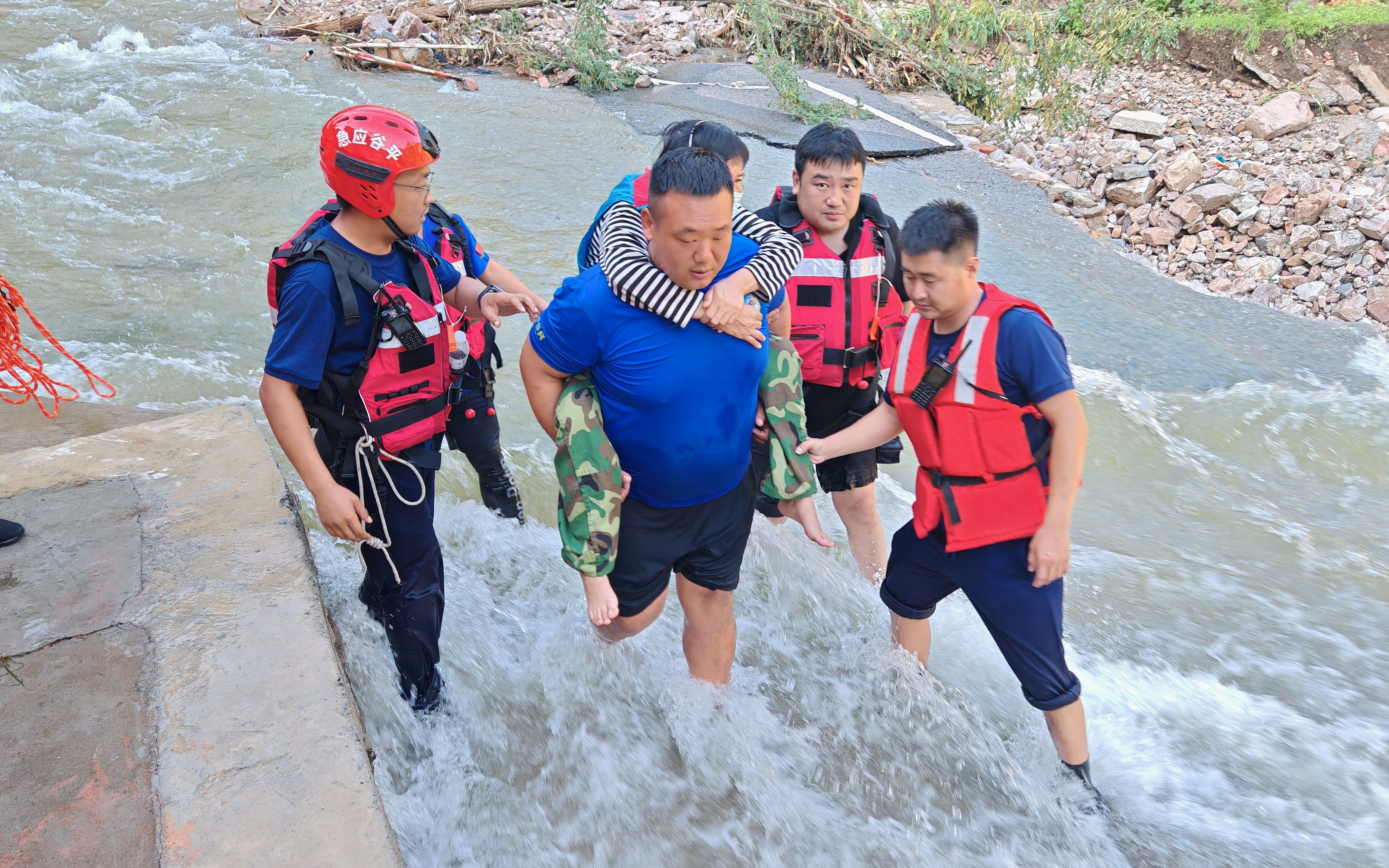 “幸好平谷区城管局派来了机械增援抢修,我们才能顺利抵达对岸。”可后面的路途更是难行。李立阳讲述,曾经的道路已经被完全冲毁,任何机械和车辆已经难以抵达,蓝天救援队在队长的带领下走在最前面,需靠双手搬运石头,才能开拓出一条可供通行的山路;行进过程中,也需要数次搭好人墙、绳索,蹚过急速前进的水流。