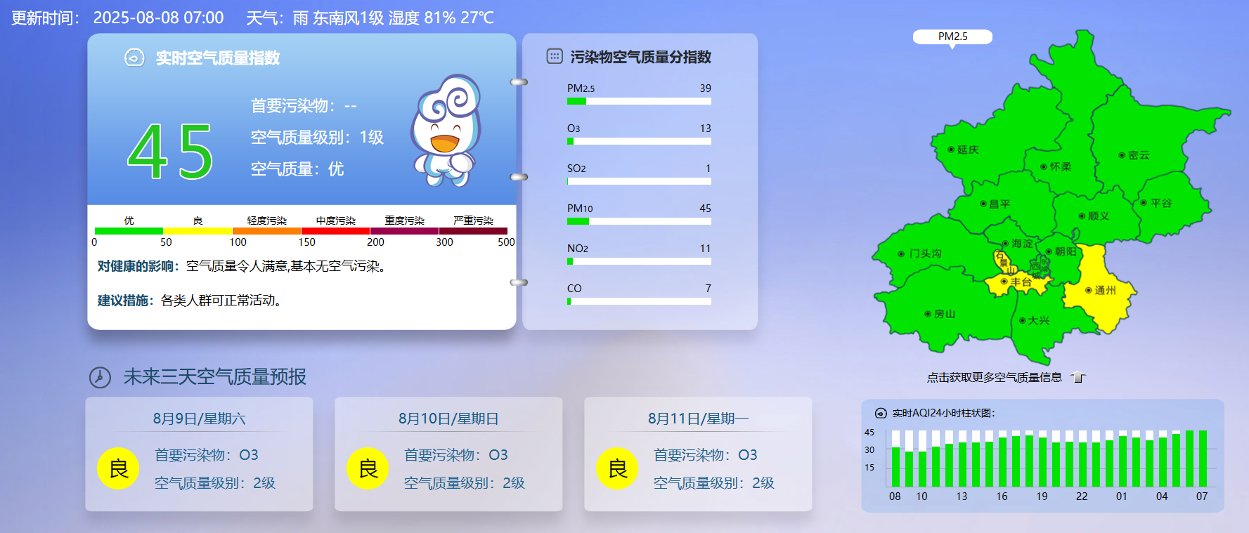 据北京市生态环境监测中心今早7时数据,目前实时空气质量指数45,空气质量优。