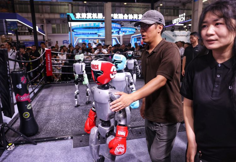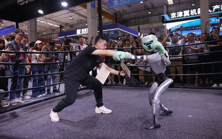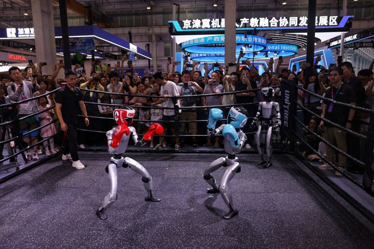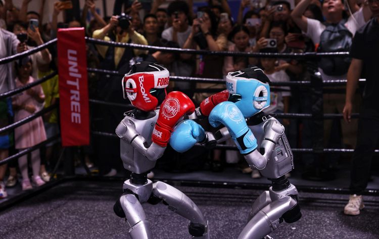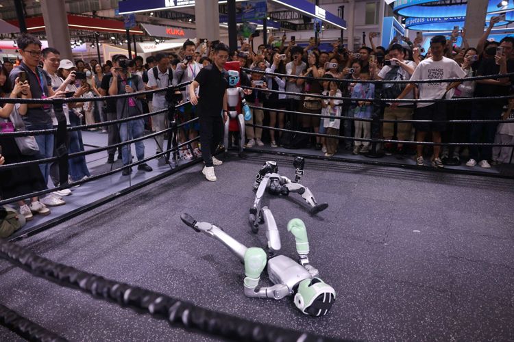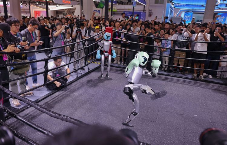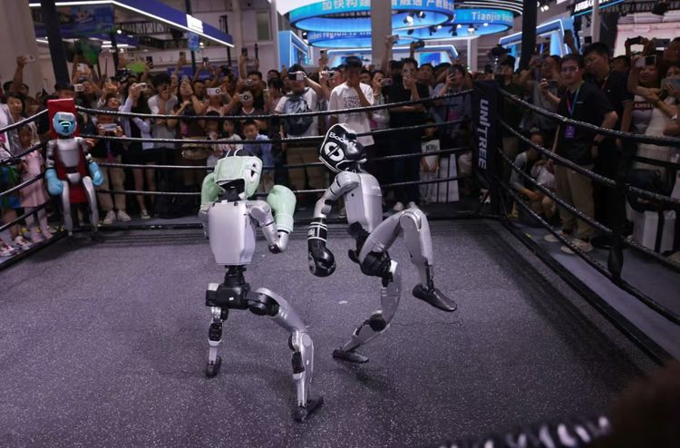 8月8日,世界机器人大会上演机器人格斗赛。4台宇树G1机器人表演贴身肉搏、侧身闪避、快速起身等格斗技巧吸引了大量观众围观。