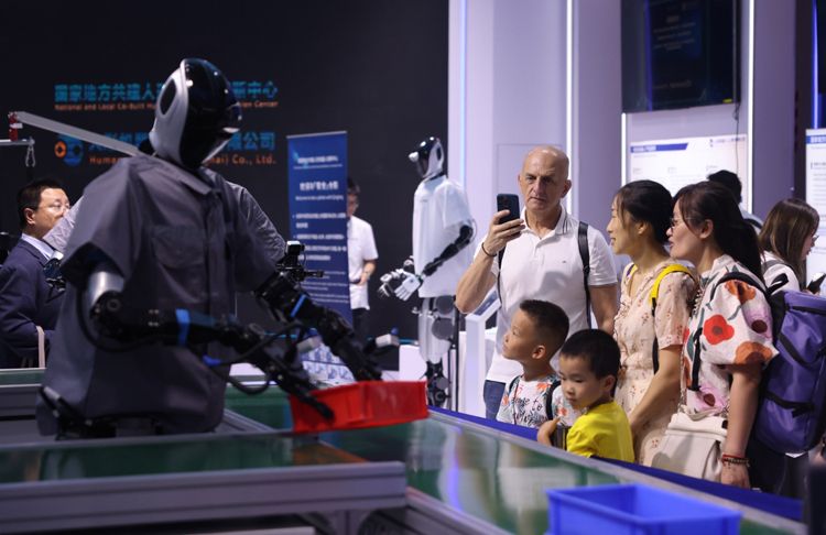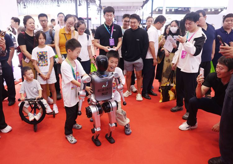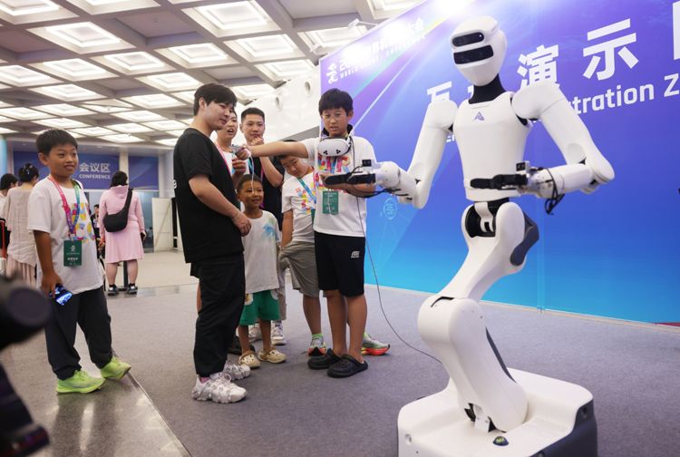 8月8日,2025世界机器人大会在北京开幕。本次大会以“让机器人更智慧,让具身体更智能”为主题,吸引了200余家国内外优秀机器人企业参展,其中人形机器人整机企业数量创下全球同类展会之最。图为小朋友在和机器人互动玩耍。