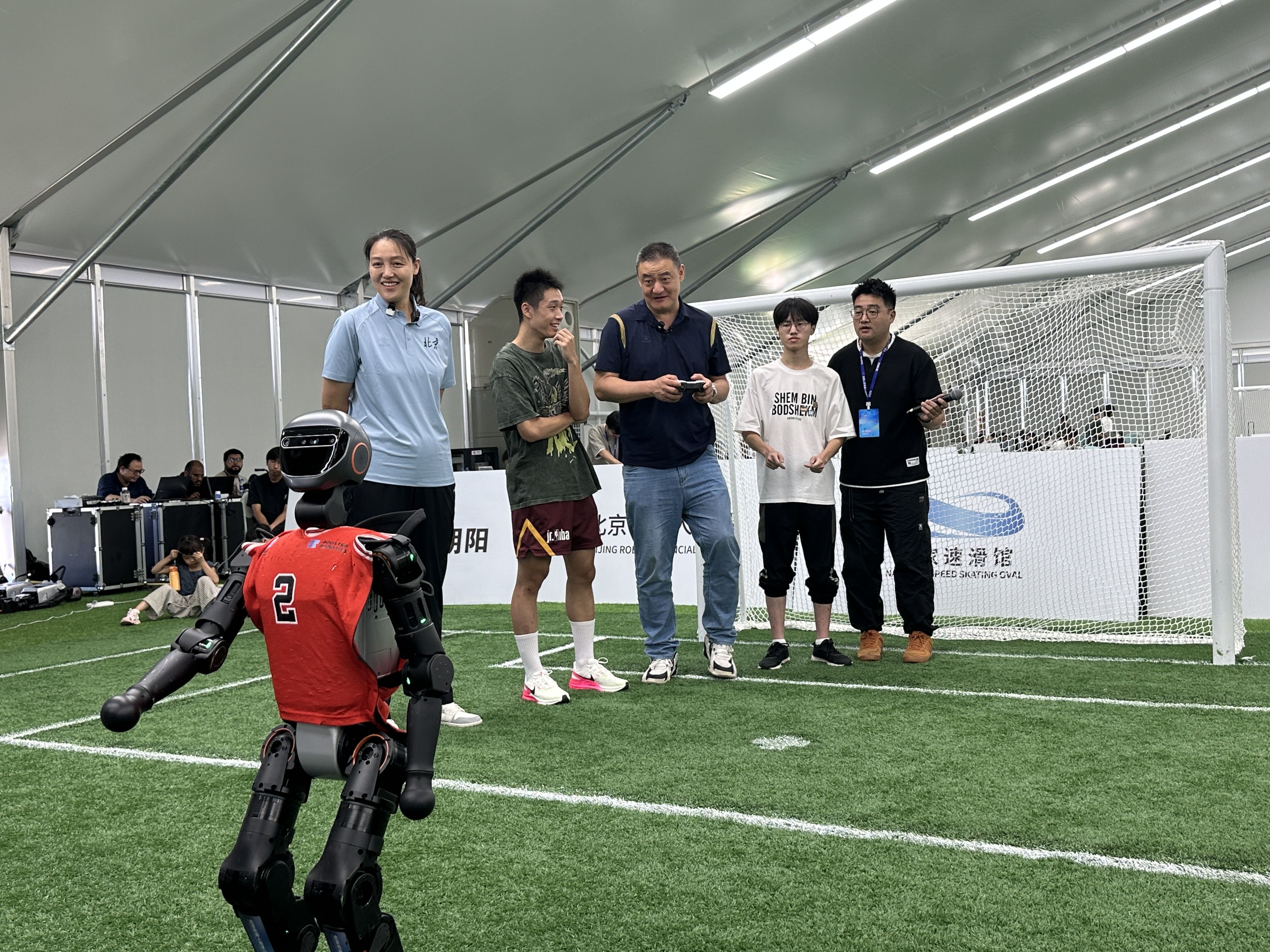 “我知道咱们祖国强大,没想到这么强大。”这是焦健来到北京人形机器人赛训基地的第一印象。在赛队工作人员的协助下,他尝试操控人形机器人完成了定点射门动作。