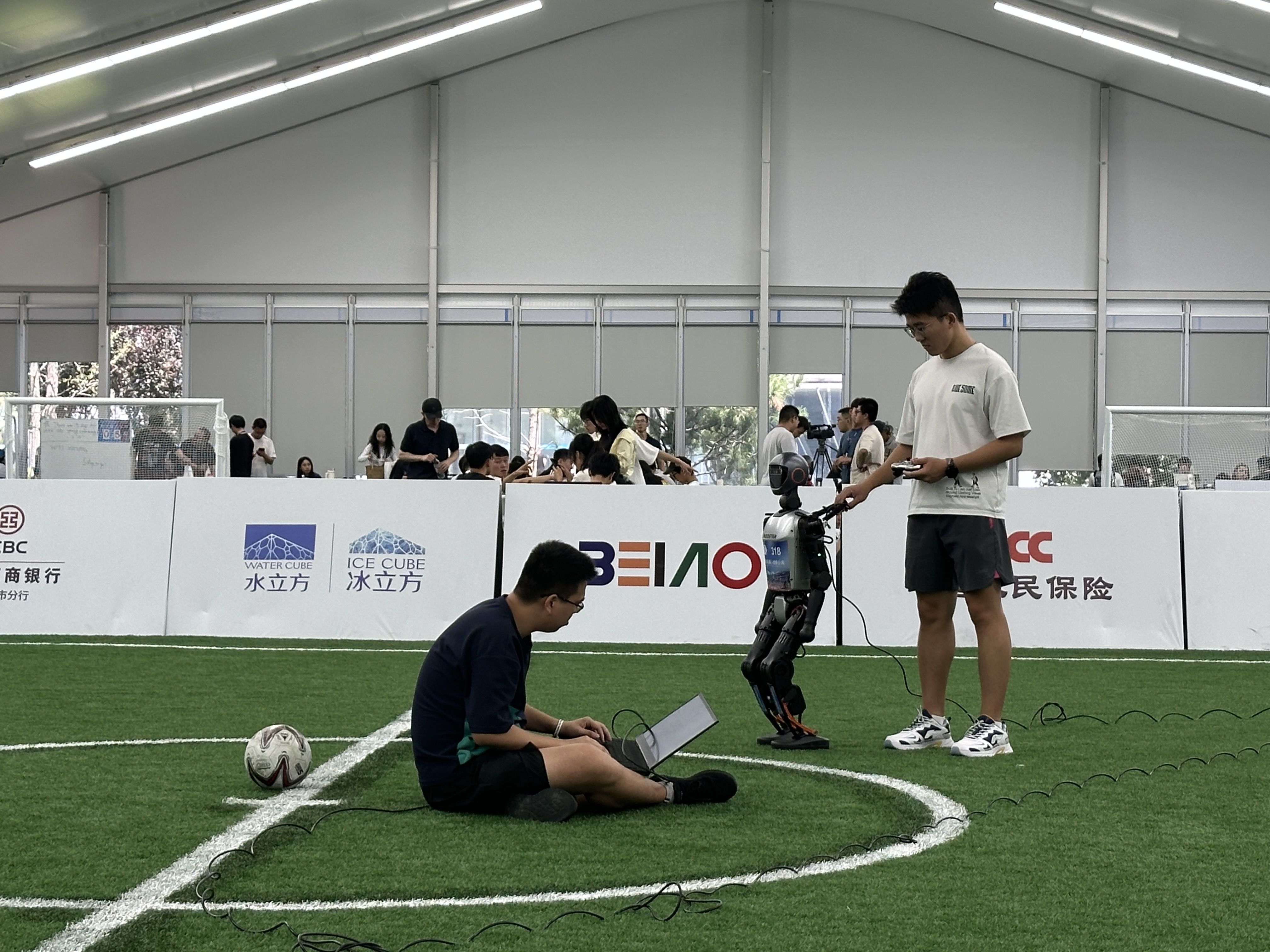 高小松介绍,大部分队伍目前都完成了决策阶段,这几天是最后的练习,下周一就开始外围赛了。今天的表演赛中,机器人多次碰撞倒地,有的还“受伤”被抬出场外,这也是人形机器人目前比赛的一个特点。高小松所在的赛队参加的是足球3V3项目,他说比赛中难免碰撞,尽量要确保两到三台机器人同时在场,这对团队协作是个不小的考验。