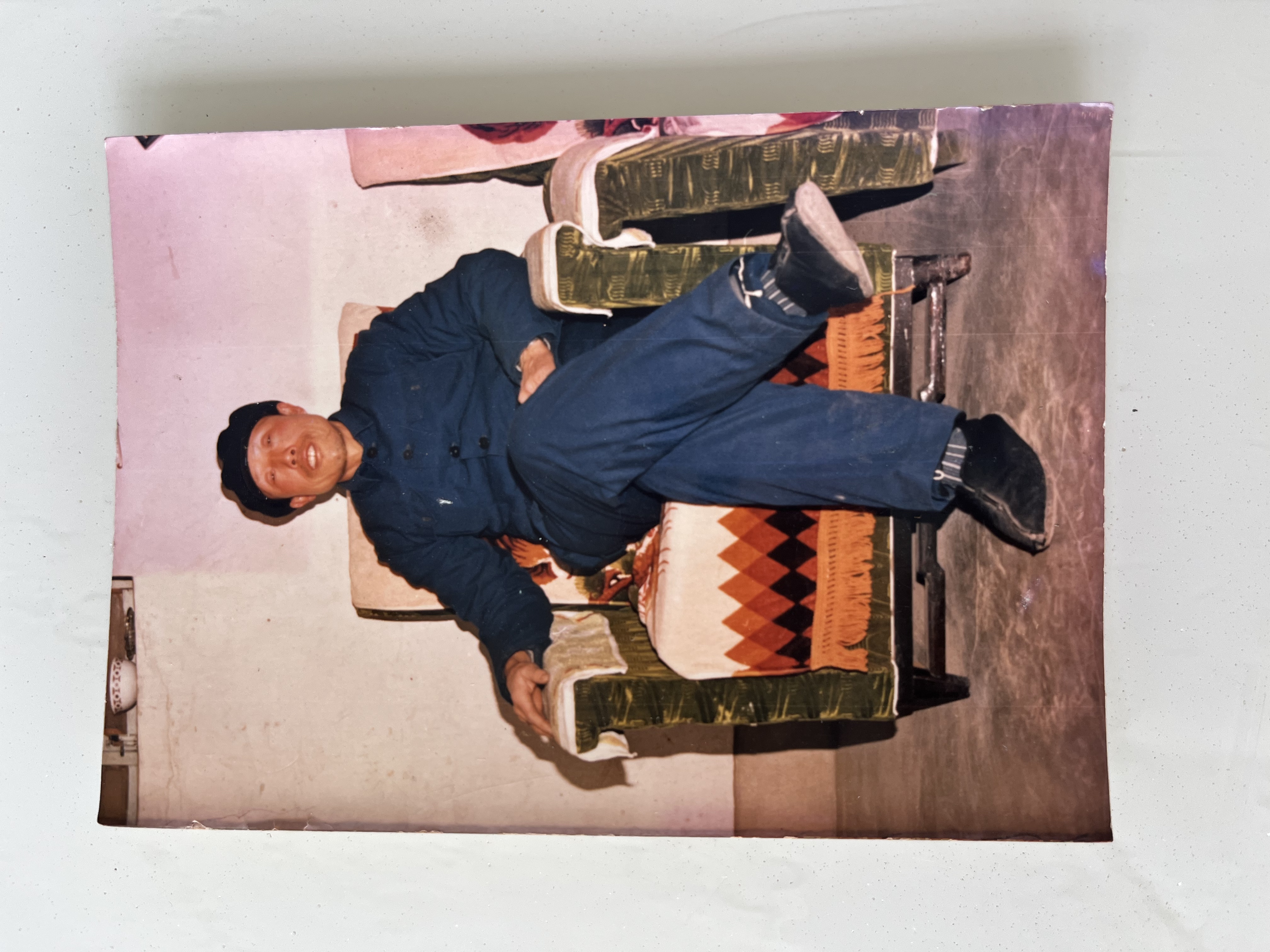 在刘耀春为父亲保留下来的早年时期的照片中,有一张是复员回村后的。刘福田身着一身深蓝色中山装,跷腿坐在沙发上,脸上挂着从容的笑意。