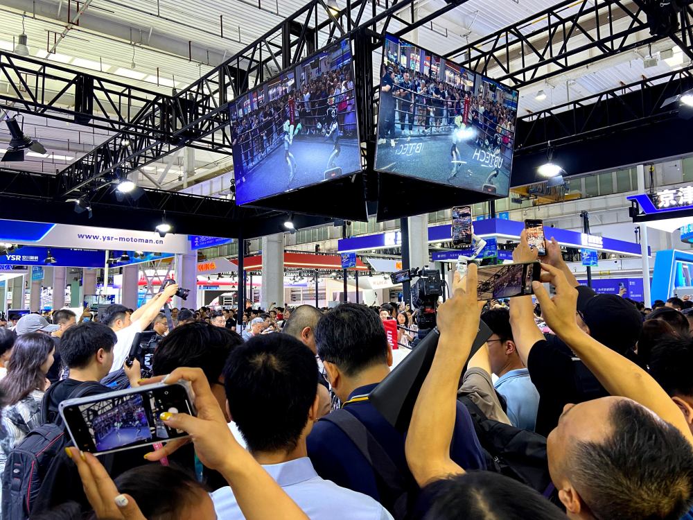 宇树科技机器人展台被围堵得水泄不通,只能看到无数手臂拿着手机抢拍。上方屏幕上,两名机器人拳击选手正挥拳激烈比拼,受力摔倒后,快速翻转站起,继续投入战斗。其对面,一个小型足球场也被挤得难以下脚。球场上,加速进化机器人选手T1和K1正激烈拼抢,围观的孩子们跟着主持人大喊着“加油”,现场气氛犹如真人比赛般热烈,一不留神,球进了。