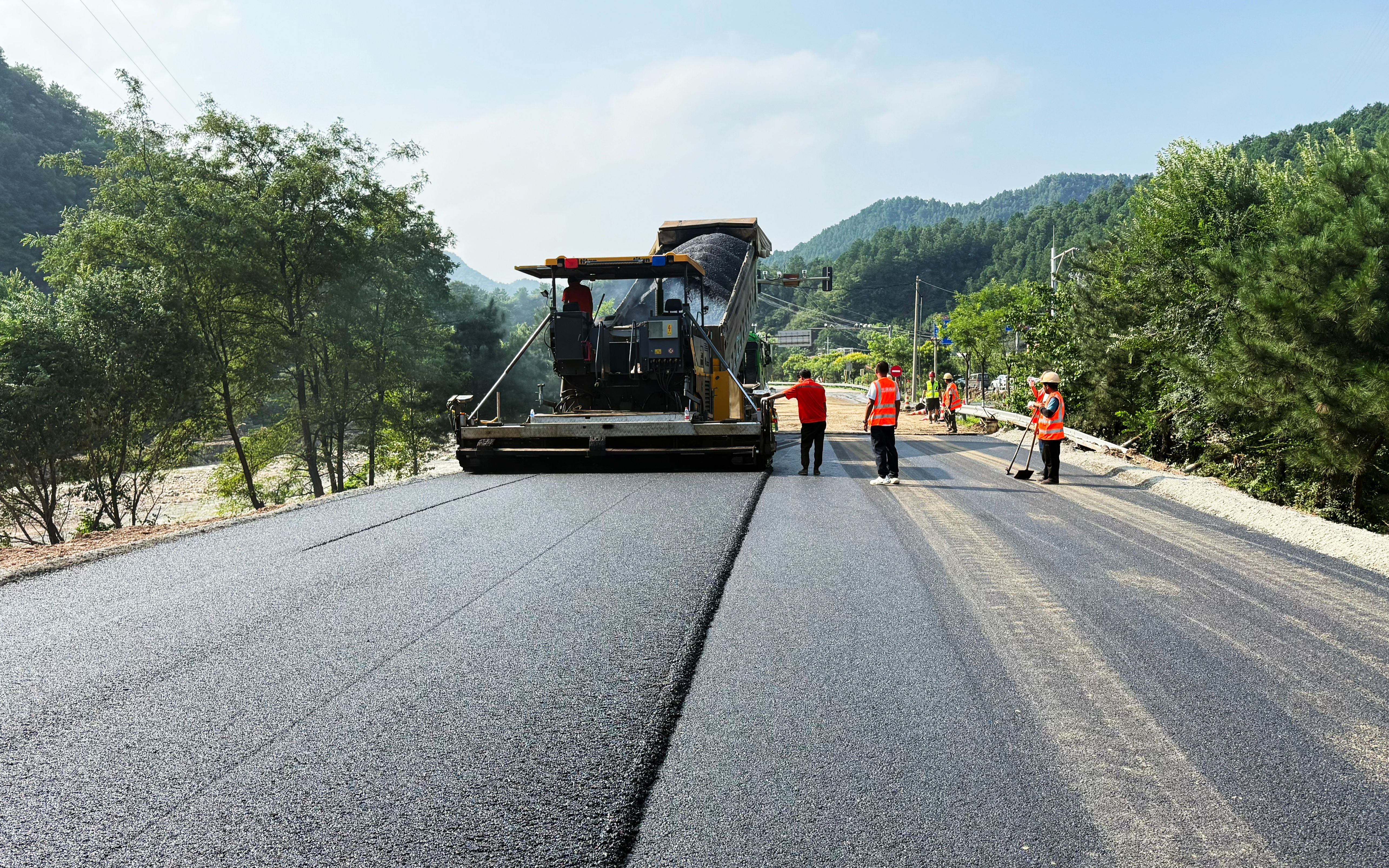 怀柔111国道,养护工人和机械设备一起摊铺沥青路面。北京市交通委供图