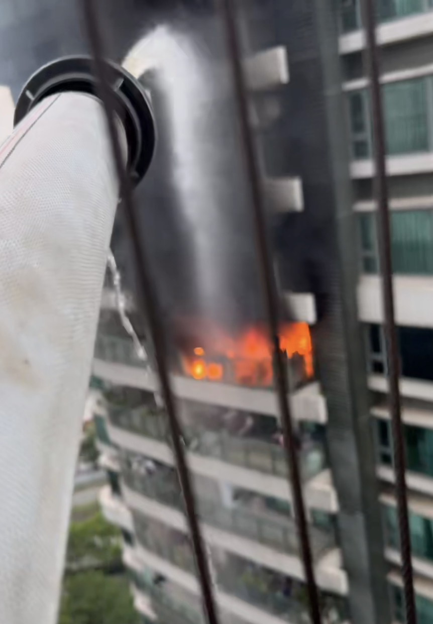 坚持了20分钟左右,叶金峰感觉到了吃力,水量也小了些。他和邻居交换位置,自己去把水调大,又返回阳台接过消防水带。虽然这样喷射的距离更远,但后坐力也更大,他跪在地上,用肩膀扛着水枪头,身体、手脚都压着水管,并喊邻居去寻求支援。“当时持续了大概有5分钟,水的压力实在太大了,如果我控制不住它、被甩起来的话,对我来说也是非常危险的。我甚至有点绝望,自己是不是要‘交代’在这里了。”叶金峰回忆。