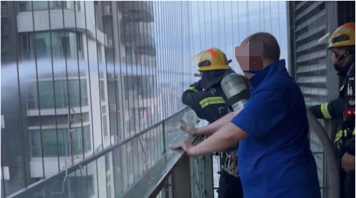 好在物业工作人员及时赶来,和叶金峰一起控制住了消防水带。大概又过了10分钟,两名消防员上楼接过水带,和地面的消防力量等共同配合,将火扑灭。