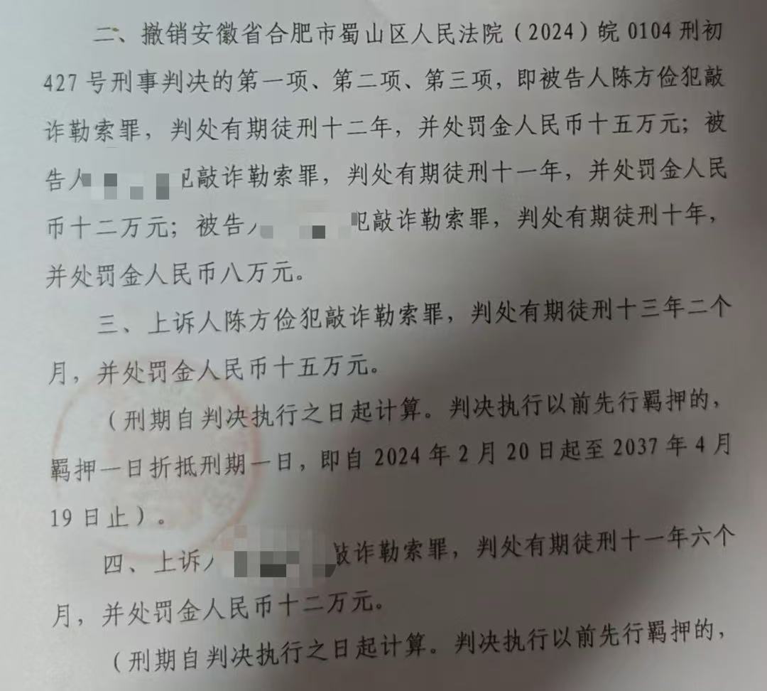 今年4月17日,合肥市蜀山区人民法院做出一审判决,认定四名被告人构成敲诈勒索罪,分别判处有期徒刑六年至十二年不等。一审宣判后,四名被告人提出上诉,蜀山区检察院以量刑过轻为由提出抗诉。