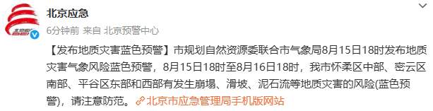 北京发布地质灾害气象风险蓝色预警