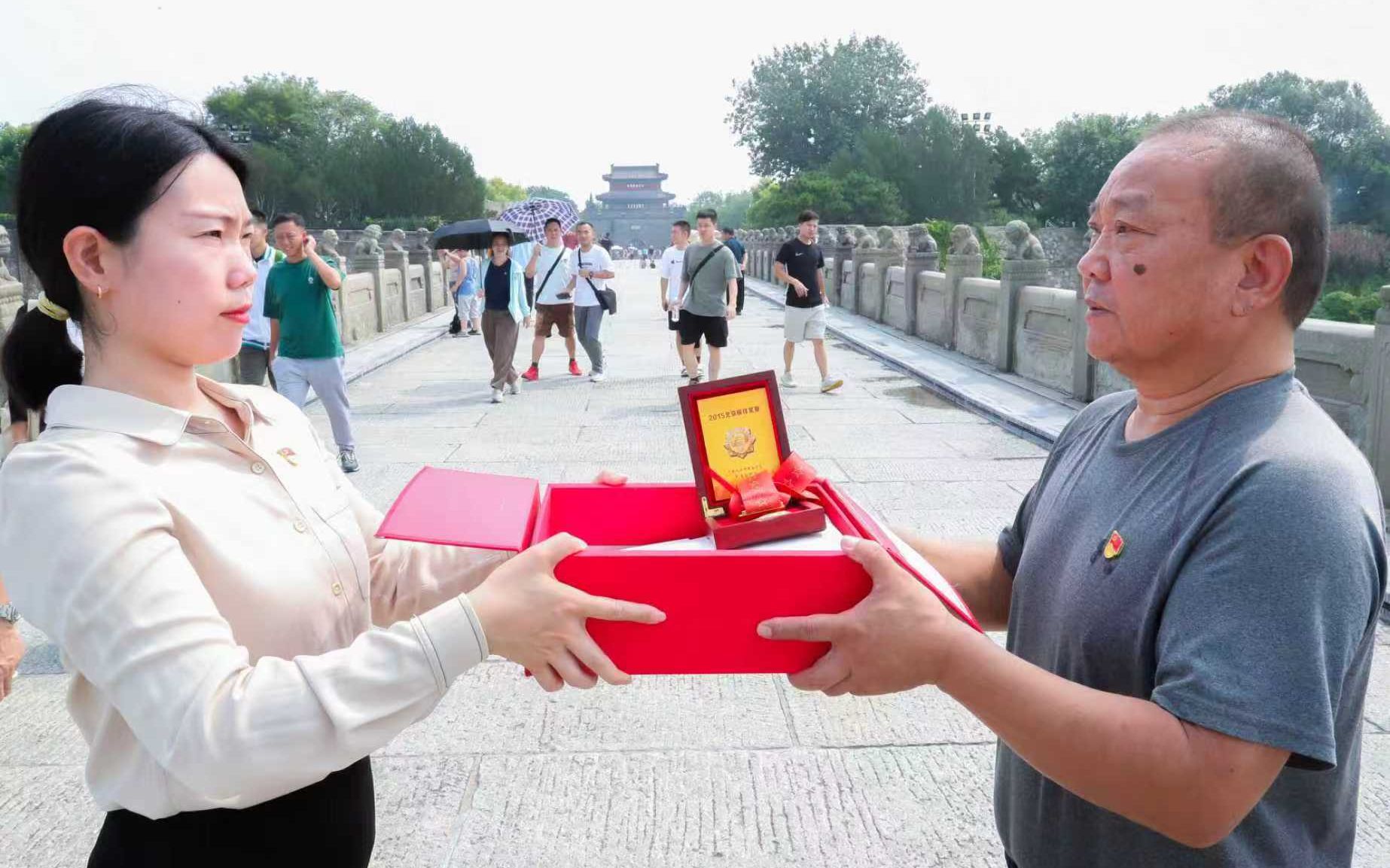 8月15日上午,卢沟桥上,郑然(左)从父亲郑增民手中接过红匣。