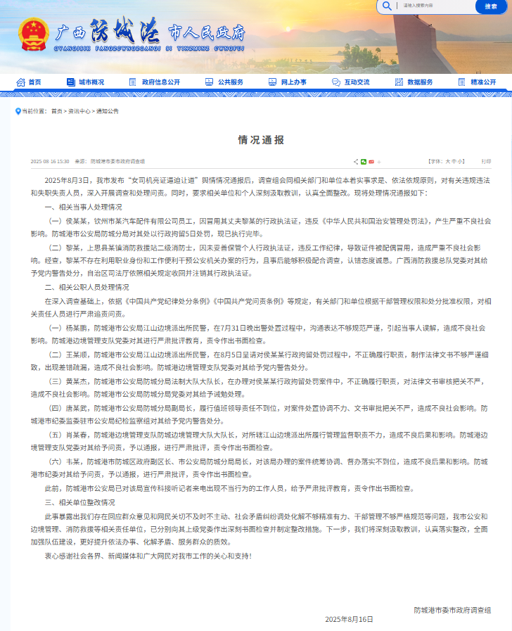 新京报讯 8月16日,防城港市委市政府调查组发布情况通报,全文如下: