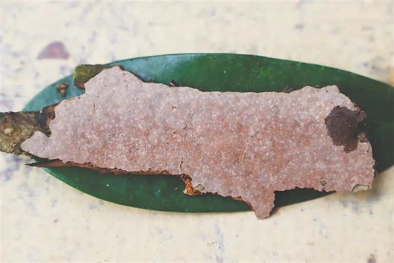 粒状粉孢革菌发现于尖峰岭片区。粒状粉孢革菌的子实体为革质,表面具轻微小颗粒状,呈浅橘色至灰橘色,发现它时像是一块铺在伏木上的丝绒布,看起来很有质感。