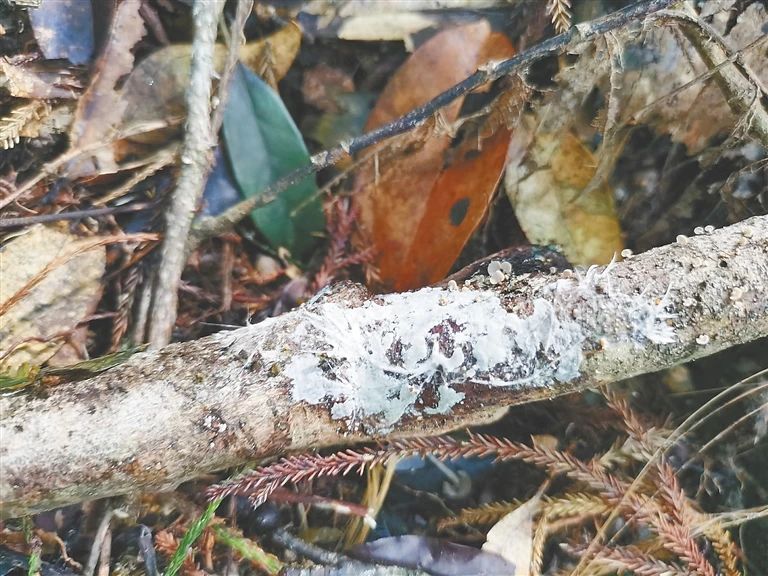 中国热带农业科学院科研人员介绍,极白无锁革菌是在霸王岭片区发现,生长在阔叶树腐朽木和落枝上。该物种的主要特征为子实体一年生,呈平伏状,目前仅发现于海南。科研人员介绍,它新鲜时是油蜡的质感,雪白色,就像撒在腐木上的碎雪,而干后变成白色至乳白色,像一层薄薄脆脆的白巧克力。
