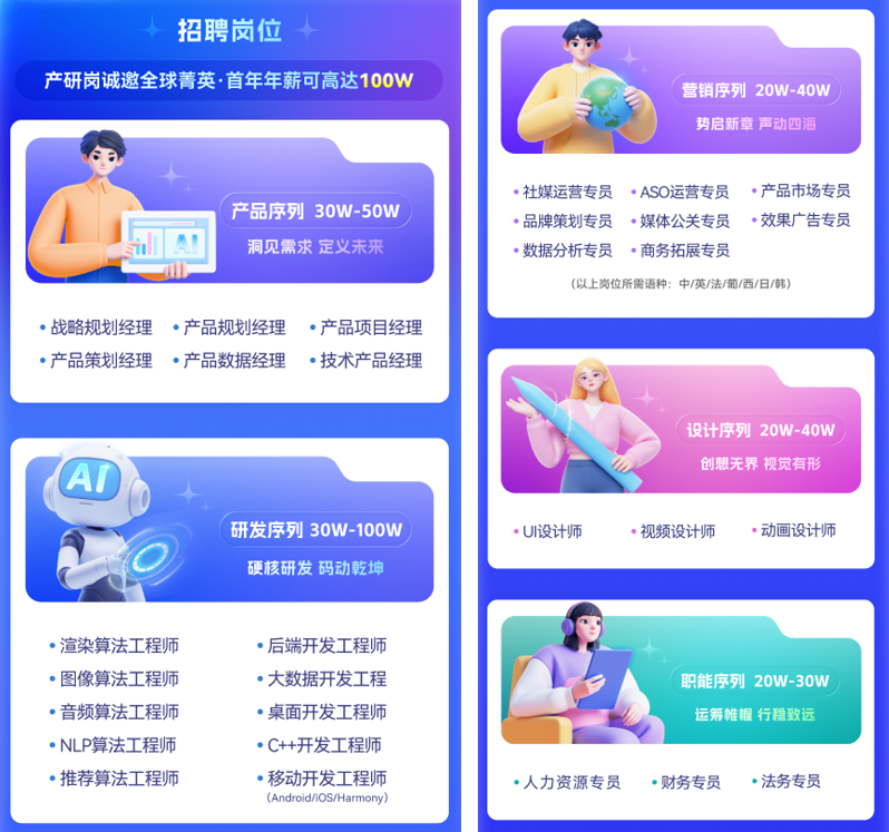 此次,产品、研发类岗需求大幅增长,产品类含战略规划、产品规划、产品数据等岗位;研发类涉及渲染算法、推荐算法、图像、音频及大模型算法、以及移动开发和桌面开发等核心领域;营销岗招聘社媒运营专员、产品市场专员、品牌策划专员、媒体公关专员等;设计类涵盖UI设计、视频设计、动画设计等;职能类开放人力资源、财务、法务等岗位,更多岗位将陆续开放。
