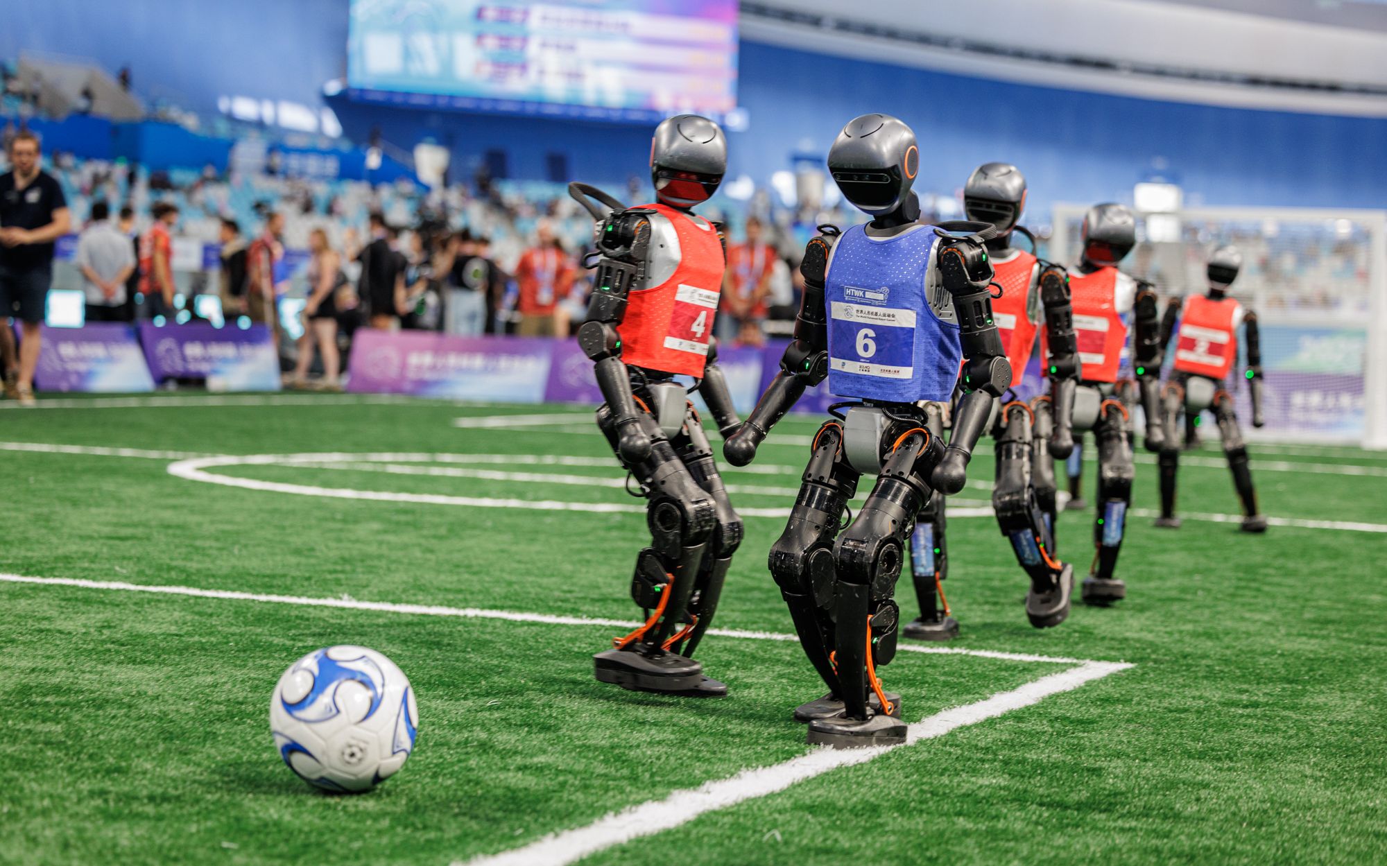 他特意提到,以往运动场草坪上的线是用白漆画上的,机器人行走较多时,白漆会褪色,对机器人的视觉识别有很大的影响。“此次人形机器人运动会的草坪使用的白色的草,赛场条件是很有利的。”
