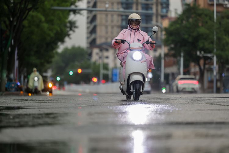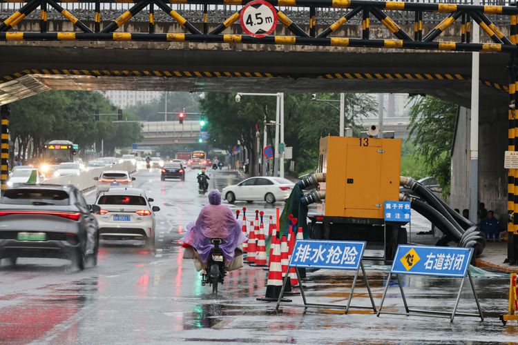 8月19日18时许,通州区杨庄路,市民骑行在雨中。