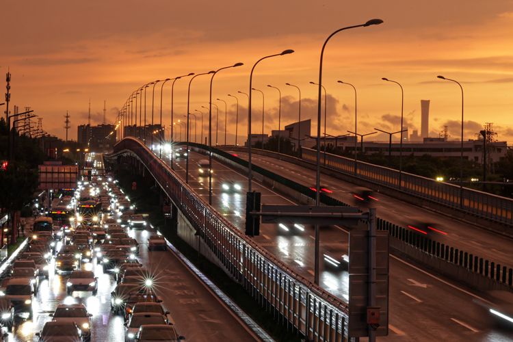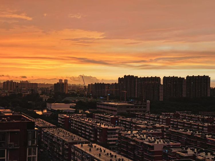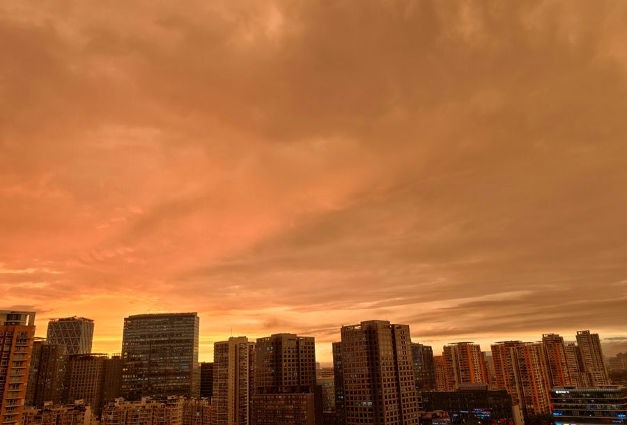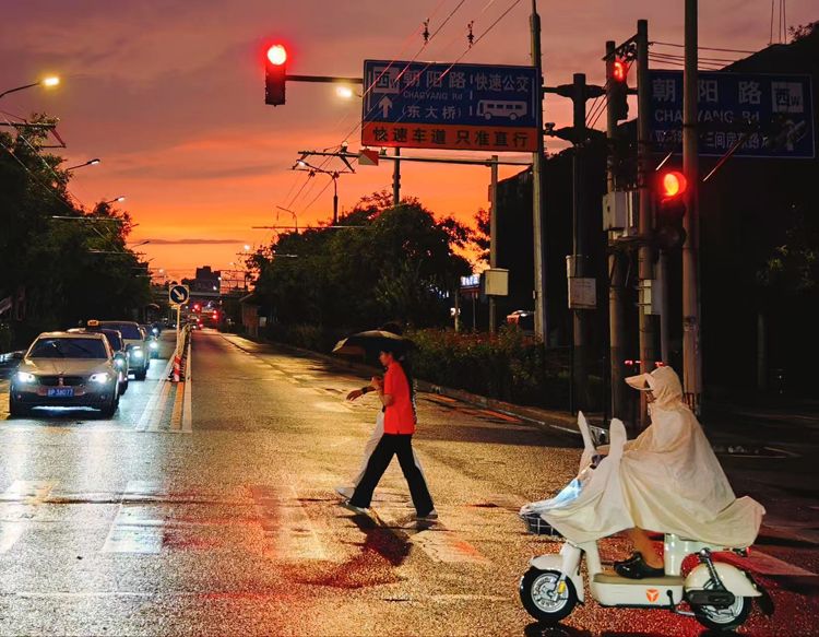 朝阳区管庄朝阳路,橙红晚霞漫染天际。