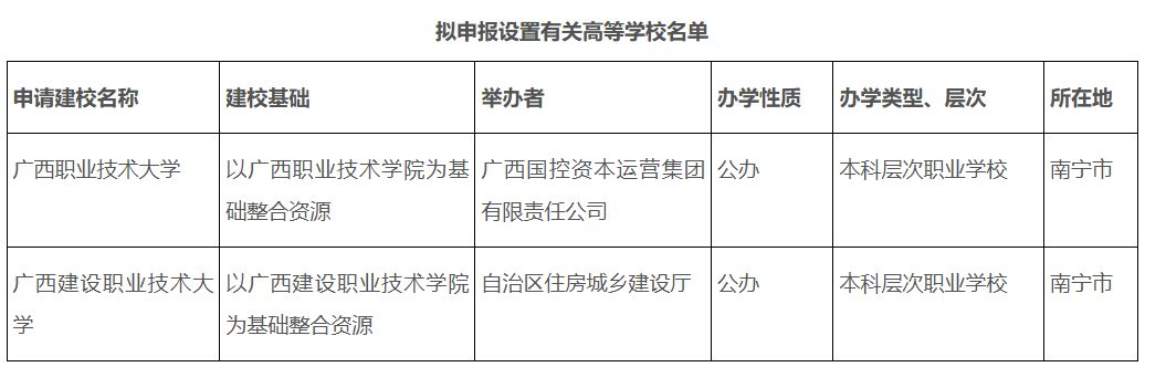 公示内容显示,拟设置的广西职业技术大学由广西国控资本运营集团有限责任公司举办;拟设置的广西建设职业技术大学由广西壮族自治区住房和城乡建设厅举办。这两所拟新设职本均为公办性质,所在地均为南宁市。