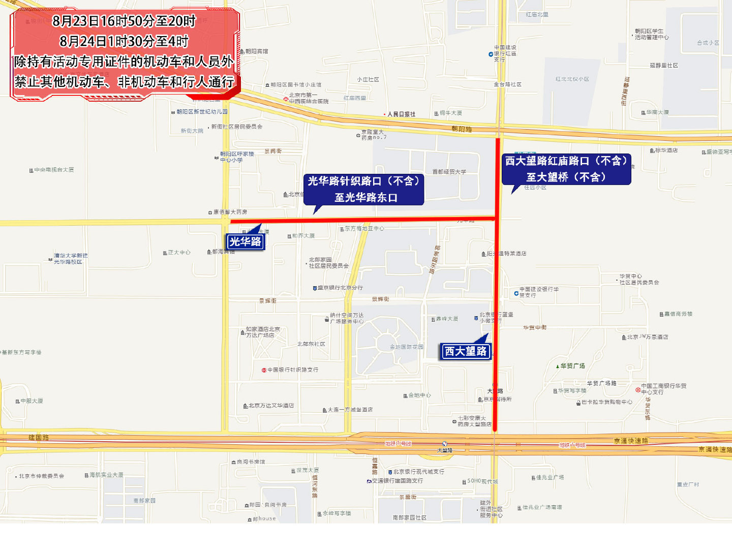 六、8月23日16时50分至20时,8月24日1时30分至4时,西大望路由红庙路口(不含)至大望桥(不含),光华路由针织路口(不含)至光华路东口,除持有活动专用证件的机动车和人员外,禁止其他机动车、非机动车和行人通行。