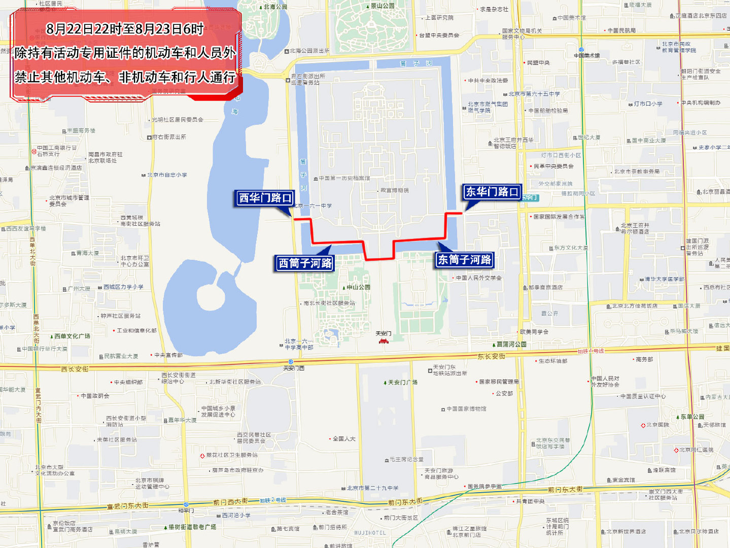 一、8月22日22时至8月23日6时,西华门路口(不含)经西华门大街、西筒子河路、东筒子河路、东华门大街至东华门路口(不含),除持有活动专用证件的机动车和人员外,禁止其他机动车、非机动车和行人通行。