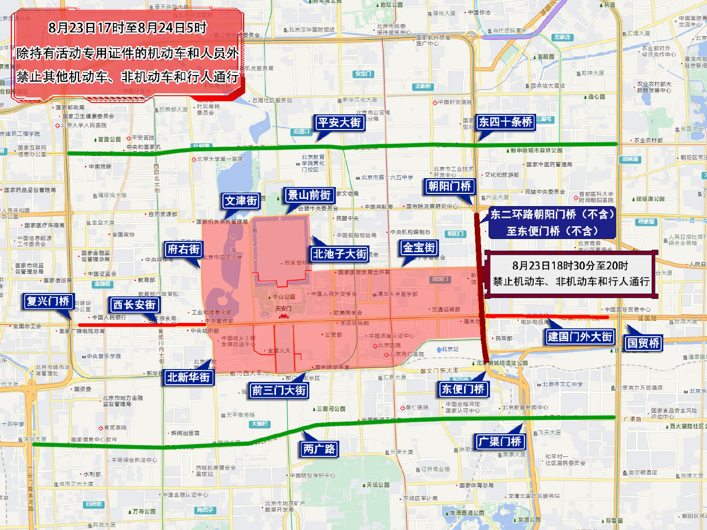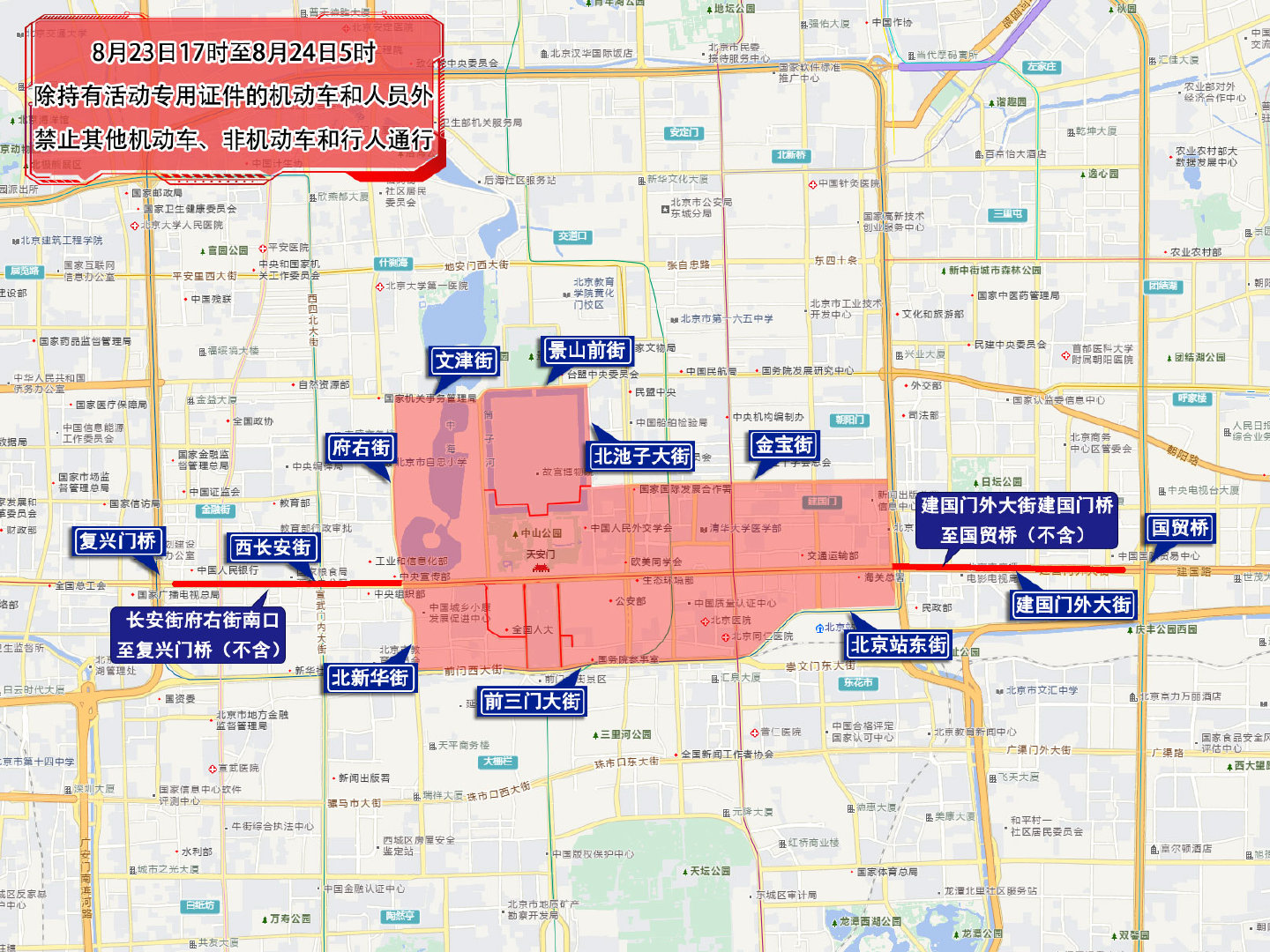 八、8月23日17时至8月24日5时,由府右街北口经府右街、北新华街至和平门路口向东,经前三门大街至崇文门路口,经北京站西街(不含南侧半幅)、北京站东街(不含南侧半幅)至北京站东街东口(不含)向北,经东二环西侧辅路(不含)至金宝街东口(不含)向西,经金宝街、金鱼胡同、东安门大街、东华门大街至东华门路口向北,经北池子大街、景山前街、文津街至府右街北口以内区域;长安街由府右街南口至复兴门桥(不含);建国门外大街由建国门桥至国贸桥(不含);除持有活动专用证件的机动车和人员外,禁止其他机动车、非机动车和行人通行,区域内居民可凭身份证等有效证件步行进入。