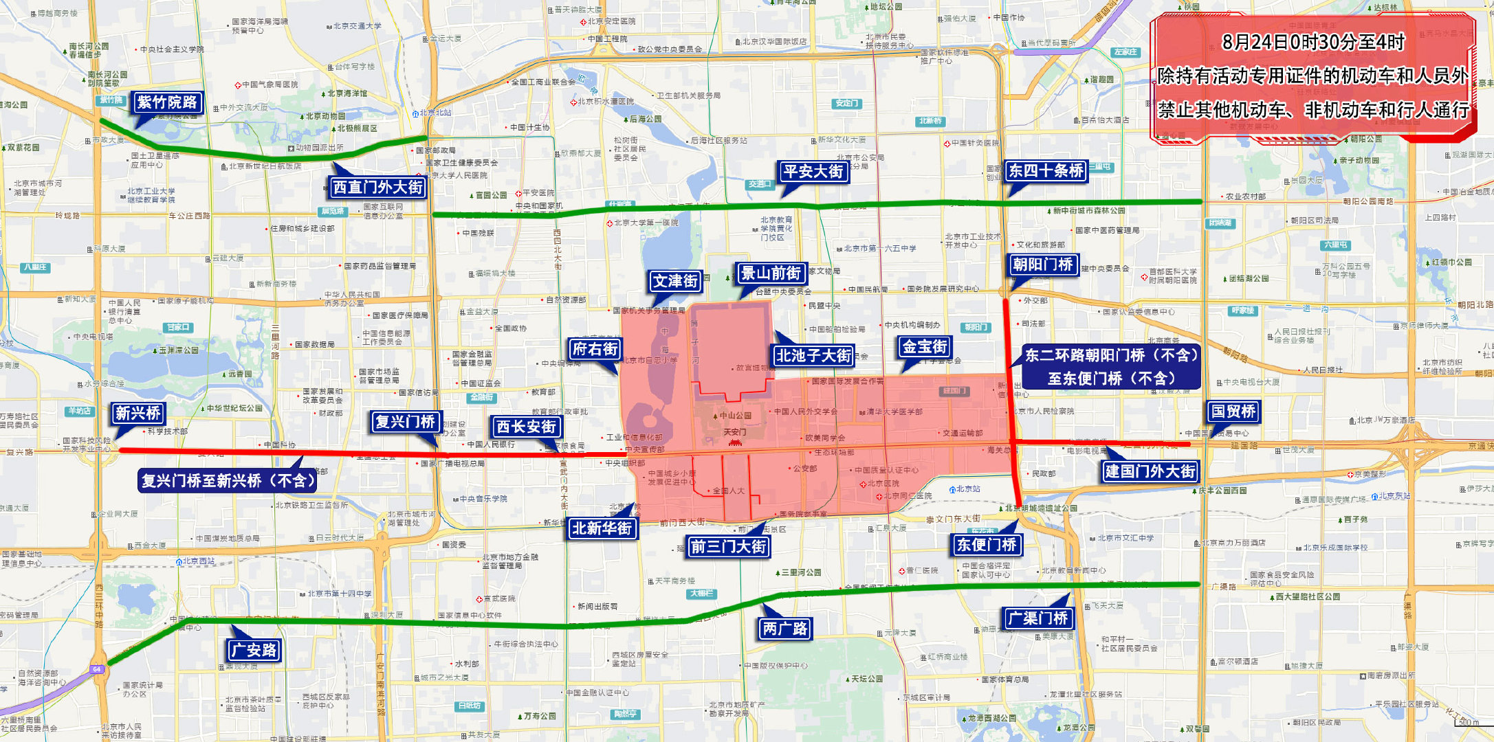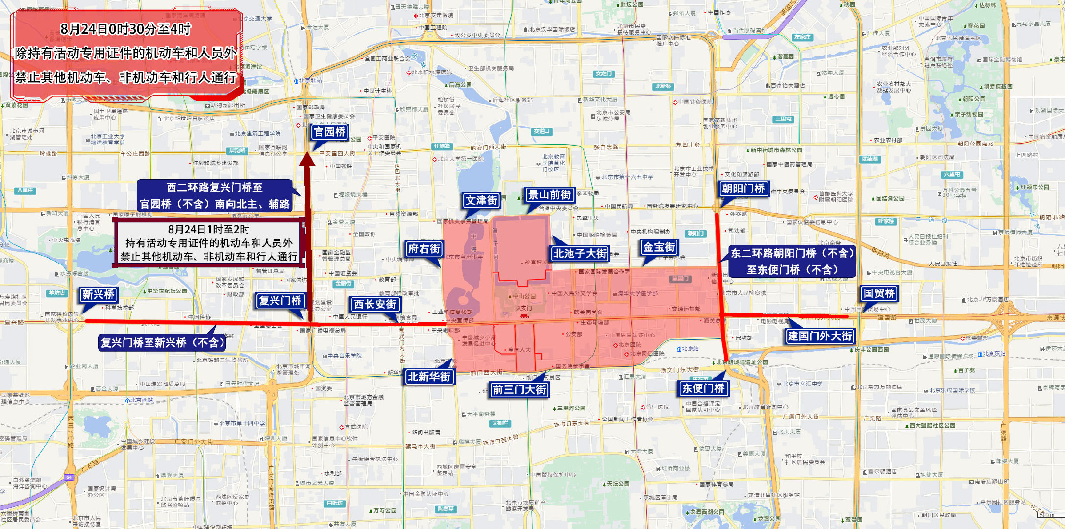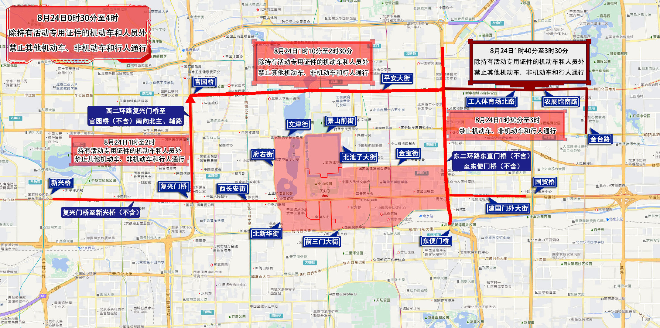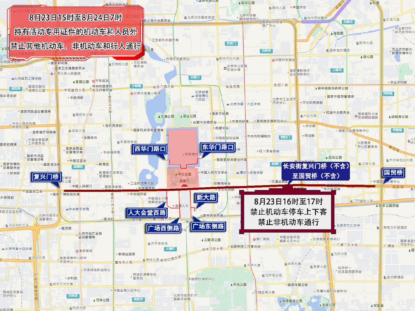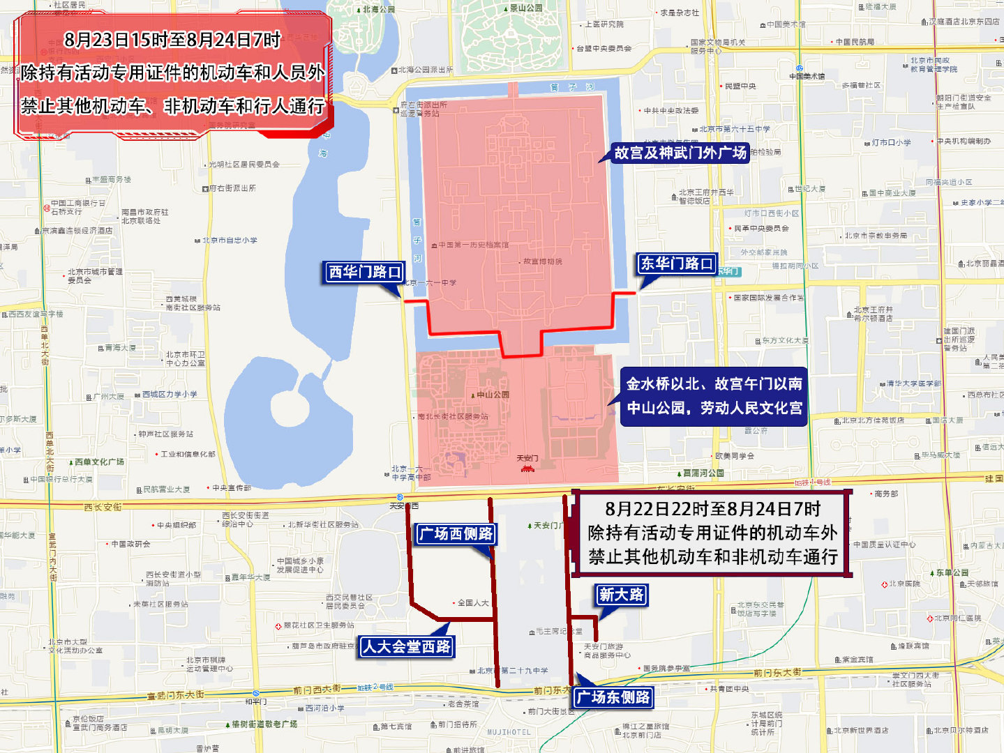 四、8月23日15时至8月24日7时,天安门前金水桥以北、故宫午门以南地区,中山公园,劳动人民文化宫,故宫及神武门外广场,西华门路口(不含)经西华门大街、西筒子河路、东筒子河路、东华门大街至东华门路口(不含),除持有活动专用证件的机动车和人员外,禁止其他机动车、非机动车和行人通行。