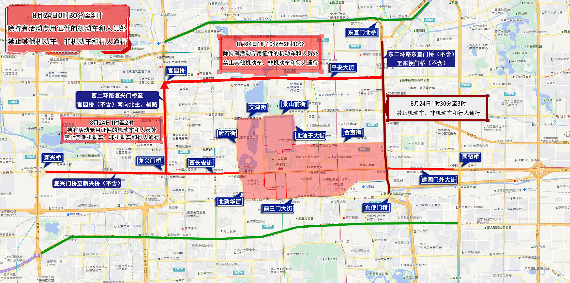 十二、8月24日1时10分至2时30分,平安里西大街,地安门西大街,地安门东大街,张自忠路至东四十条桥,除持有活动专用证件的机动车和人员外,禁止其他机动车、非机动车和行人通行。