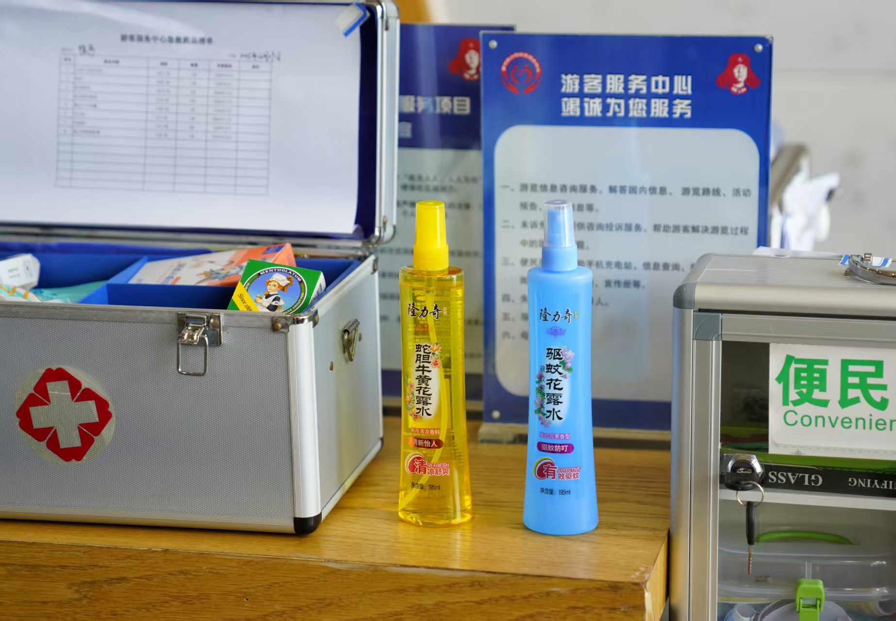 8月21日,紫竹院公园,游客较为集中的10余处场所都备有小药箱和便民服务箱,里面备有驱蚊液、花露水等防蚊止痒物品。新京报记者 薛珺 摄