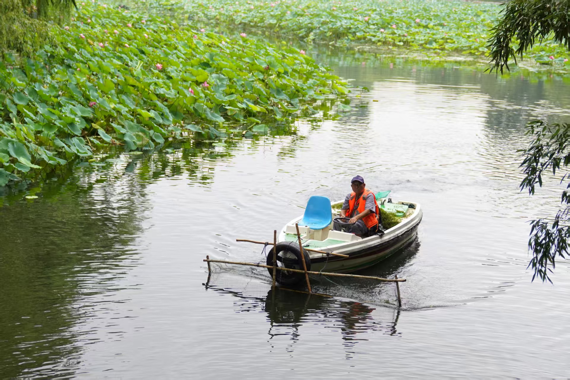 8月21日,紫竹院公园,工作人员清理水面漂浮物和水草。新京报记者 薛珺 摄