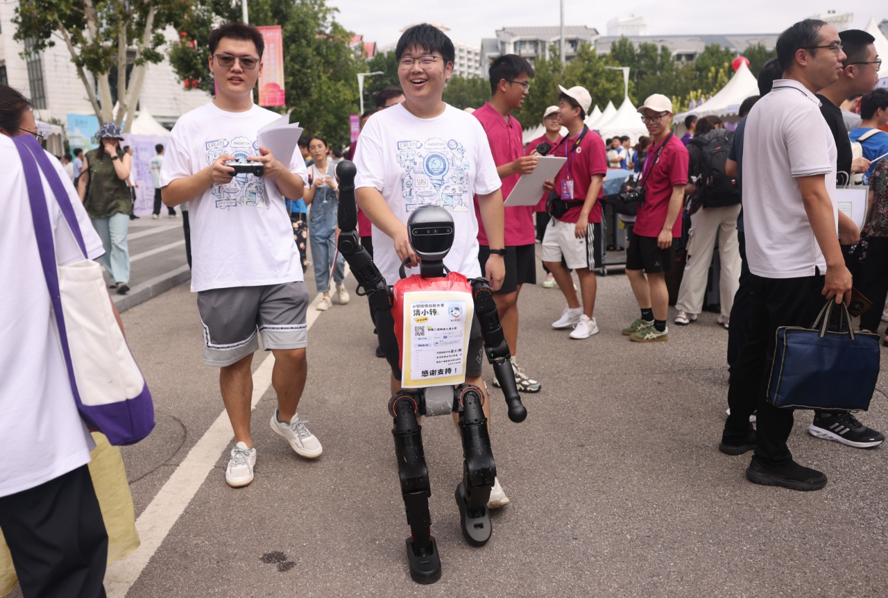 今年的迎新队伍中还有一位特别的成员——在刚刚结束的首届人形机器人足球5V5比赛中夺冠的清华火神队机器人。只见它身上贴着迎新指引,灵活地穿梭在人流中。“它原来是踢足球的,今天帮忙迎新。”负责照看机器人的同学说道。