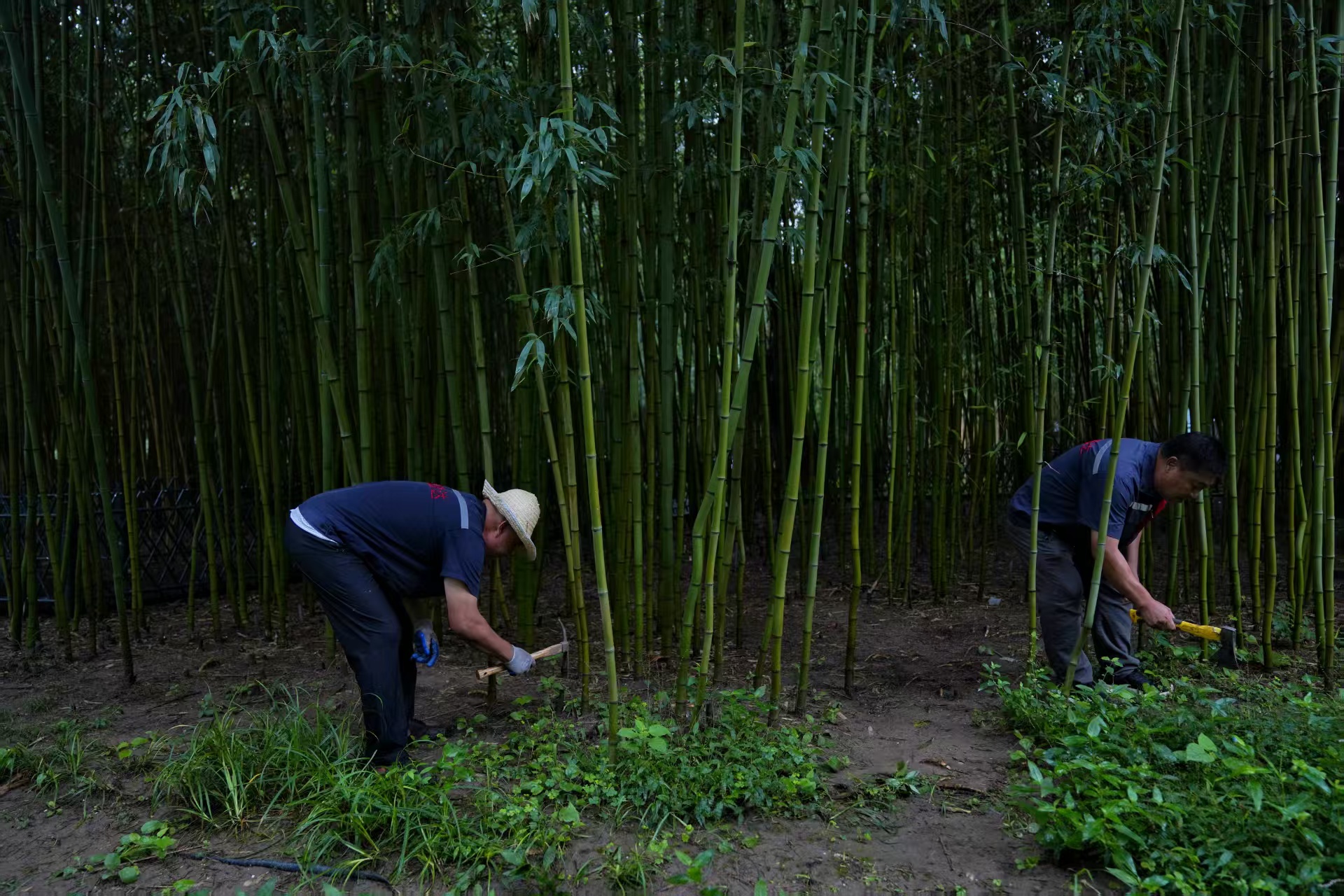 8月21日,紫竹院公园,工作人员给竹橛“改花刀”,给竹根砍出一条条裂缝,使雨后的积水得以自然排出、渗入土地。新京报记者 薛珺 摄