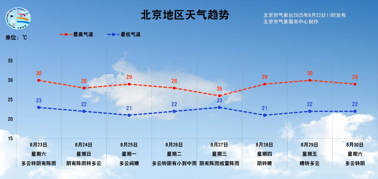下周北京天气依旧以多云到阴天为主,副热带高压控场,雷阵雨持续。三伏天已经过去,夏天的炎热逐渐消退,预计8月23日至30日,北京的最高气温为26℃~30℃;最低气温21℃~23℃。