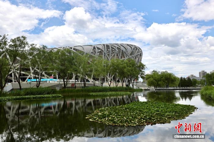 2023年7月15日,北京天气晴朗,白云悠悠。图为蓝天白云映衬下的国家体育场“鸟巢”。记者 易海菲 摄