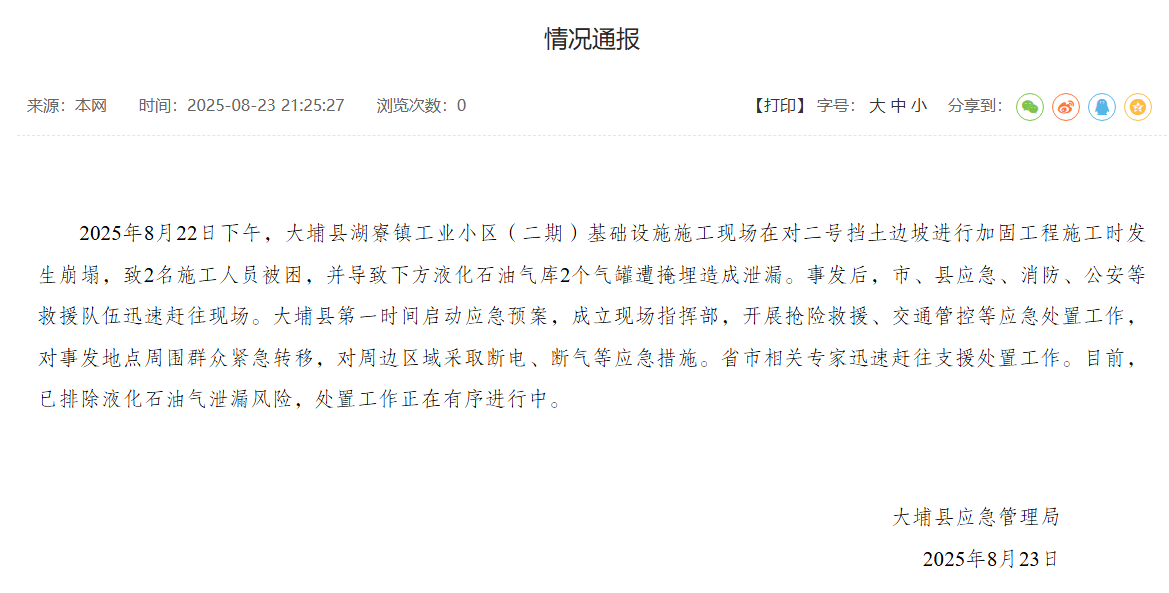 新京报讯 8月23日,大埔县应急管理局发布情况通报:2025年8月22日下午,大埔县湖寮镇工业小区(二期)基础设施施工现场在对二号挡土边坡进行加固工程施工时发生崩塌,致2名施工人员被困,并导致下方液化石油气库2个气罐遭掩埋造成泄漏。