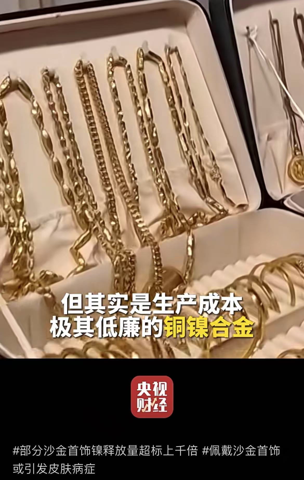 据报道,出厂价仅10元的沙金首饰,经过转手,售价可飙至上百元。令人担忧的是,部分首饰镍释放量超标上千倍,长期佩戴有可能引发皮肤瘙痒、红肿等过敏症状,对人体健康构成严重威胁。