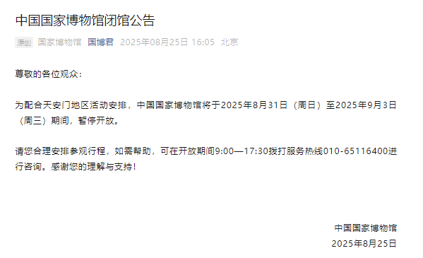新京报讯 据中国国家博物馆消息,为配合天安门地区活动安排,中国国家博物馆将于2025年8月31日(周日)至2025年9月3日(周三)期间,暂停开放。