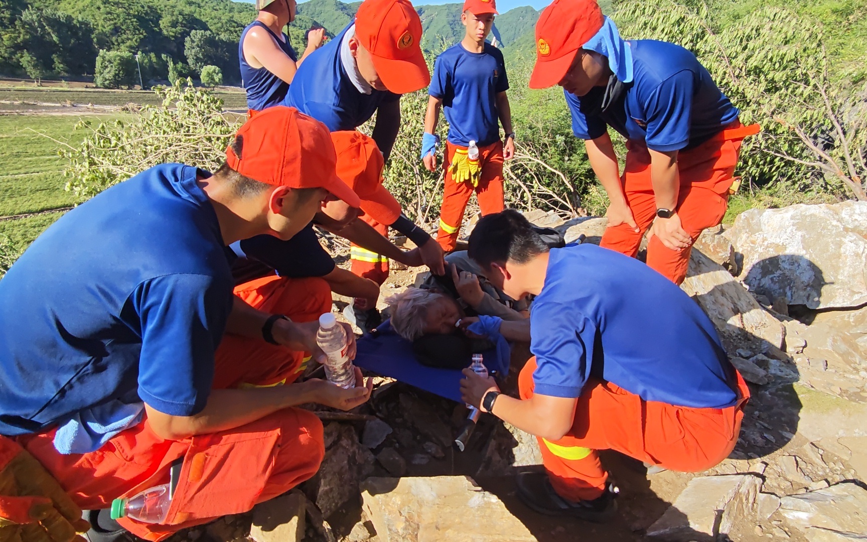 得知张女士母亲已76岁,且患有股骨头坏死、严重哮喘等疾病后,生物医药基地消防救援站的6名消防救援人员全程用担架护送她。在走过最后一处陡坡后,张女士突然激动地哭起来,“感谢你们,我真的不想给你们添麻烦,我儿子也是消防员,我知道你们很辛苦,所以我本来想带着我母亲慢慢自己走。”这让在场的消防救援人员为之动容。