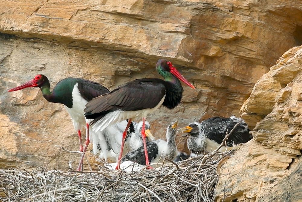 与普通水鸟的选择不同,黑鹳习惯将巢穴搭建在悬崖峭壁上,并且具有沿用旧巢的习惯,它们会年年加固修缮,进行繁衍。比如,在一个编号为3号的黑鹳巢区,这里连年诞生的“黑鹳宝宝”数量最多,因此也被巡护员们称作“英雄窝”。李理介绍,在北京,目前共有14个野生黑鹳巢穴可以观测到黑鹳活动,其中有四个,几乎每年都能见到幼鸟出生。